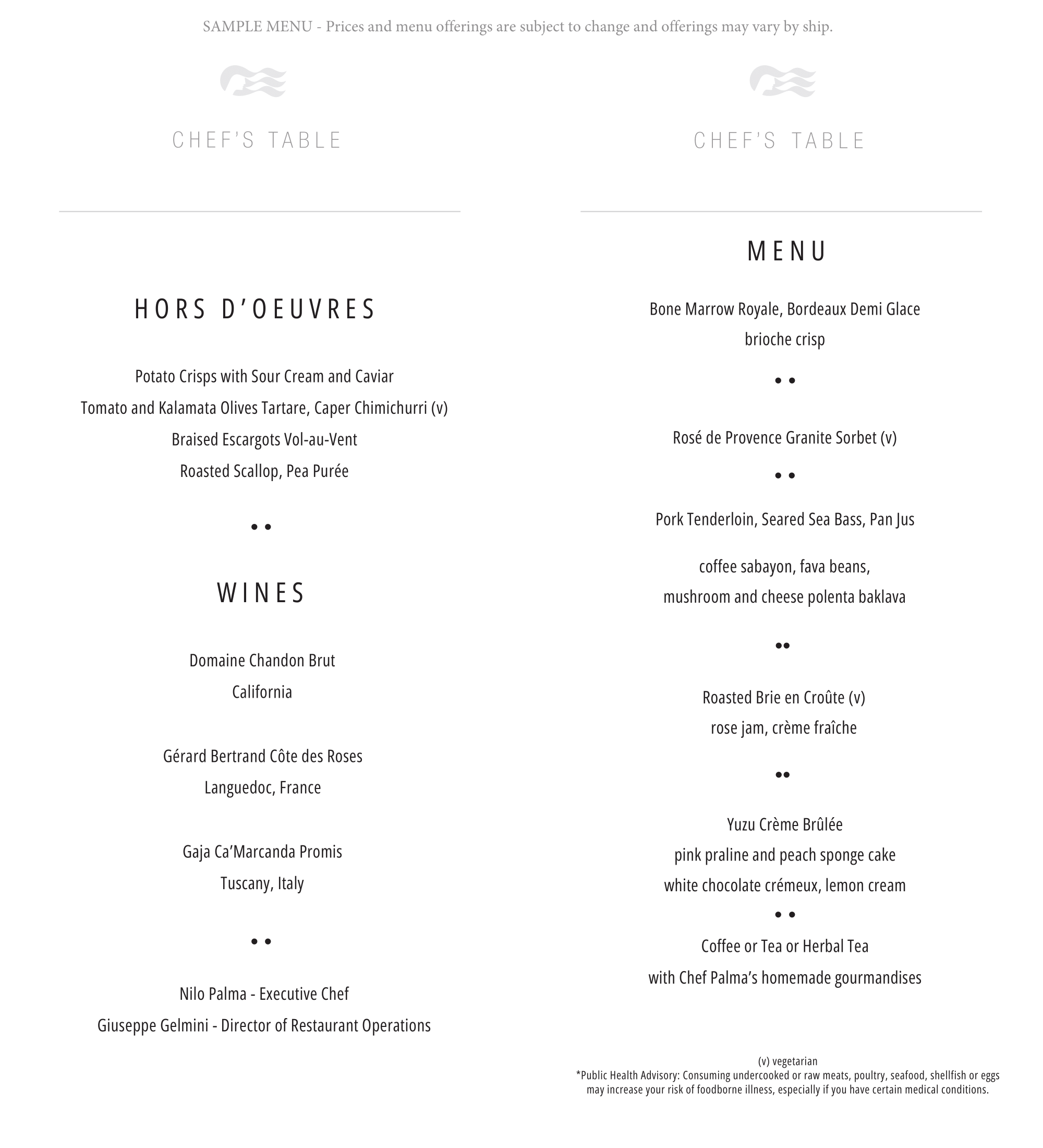 While menus vary by sailing and region, the experience typically includes an eight-course meal rarely found elsewhere on the ship, beginning with hors d’oeuvres such as crab lollipops or foie gras. Guests also tour the galley, sample appetizers, and enjoy dishes like scallop carpaccio, lobster bisque, truffle risotto, meat or seafood mains, sorbet intermezzo, and dessert. Wine pairings are included, with the sommelier presenting fine labels chosen to complement each course.