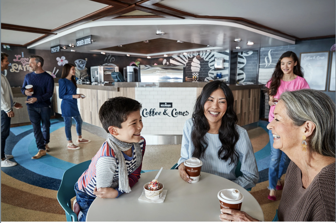 Coffee and Cones offers complimentary soft serve ice cream in chocolate, vanilla, strawberry, or swirl. Additional specialty desserts and premium beverages are available for an extra fee.