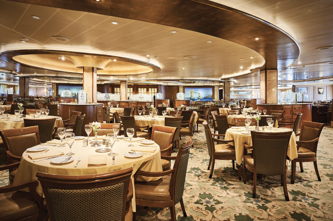 Botticelli Dining Room is typically assigned to traditional early and late fixed dinner seatings. Guests who prefer a set dining time and the same waitstaff each evening should choose this option.