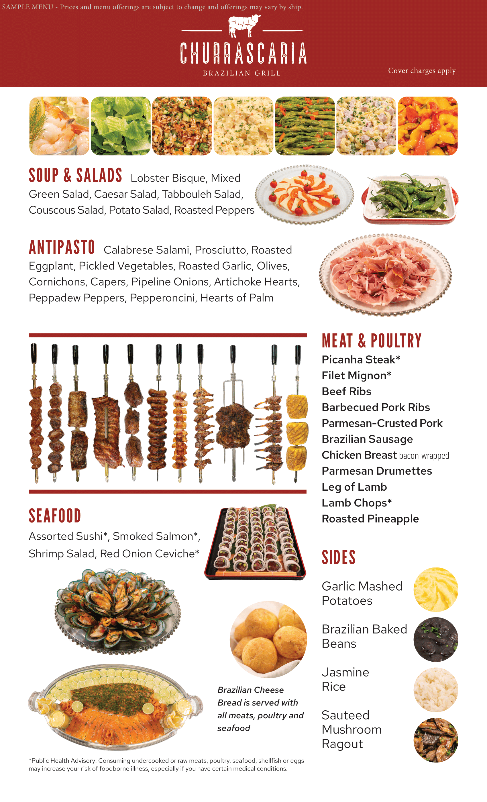 Churrascaria Grill is a specialty Brazilian steakhouse onboard Princess Cruises offering a traditional rodizio-style dining experience. The menu features a continuous service of grilled meats including picanha, filet mignon, beef ribs, pork, lamb, chicken, and Brazilian sausage, served with cheese bread, seafood selections, salads, and hot sides such as rice, beans, and mashed potatoes. Roasted pineapple and Brazilian desserts complete the meal.