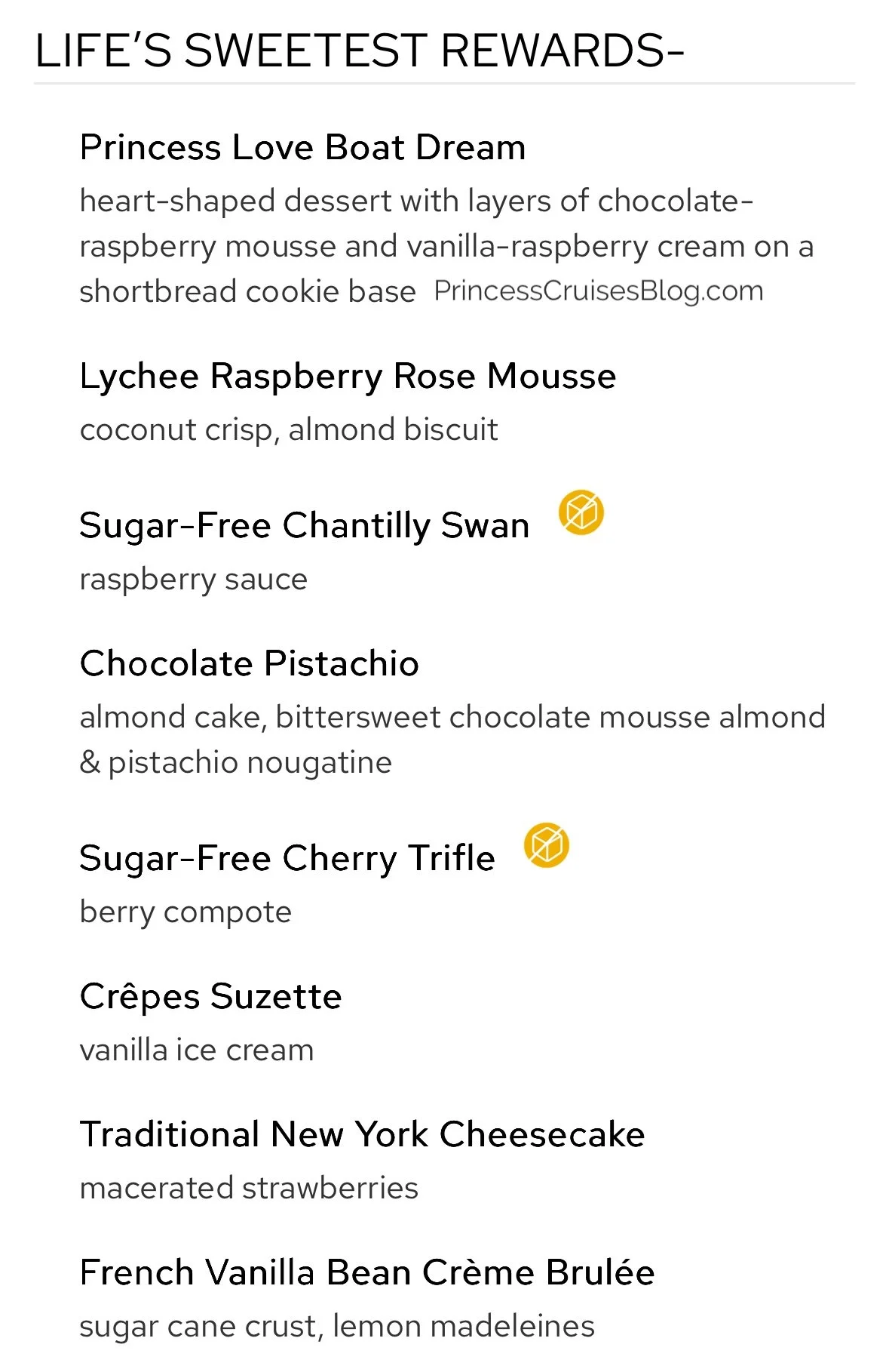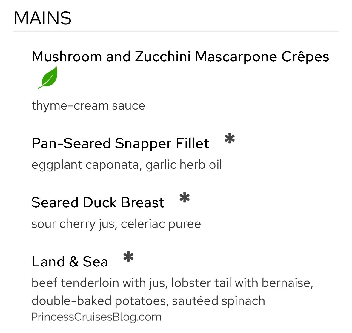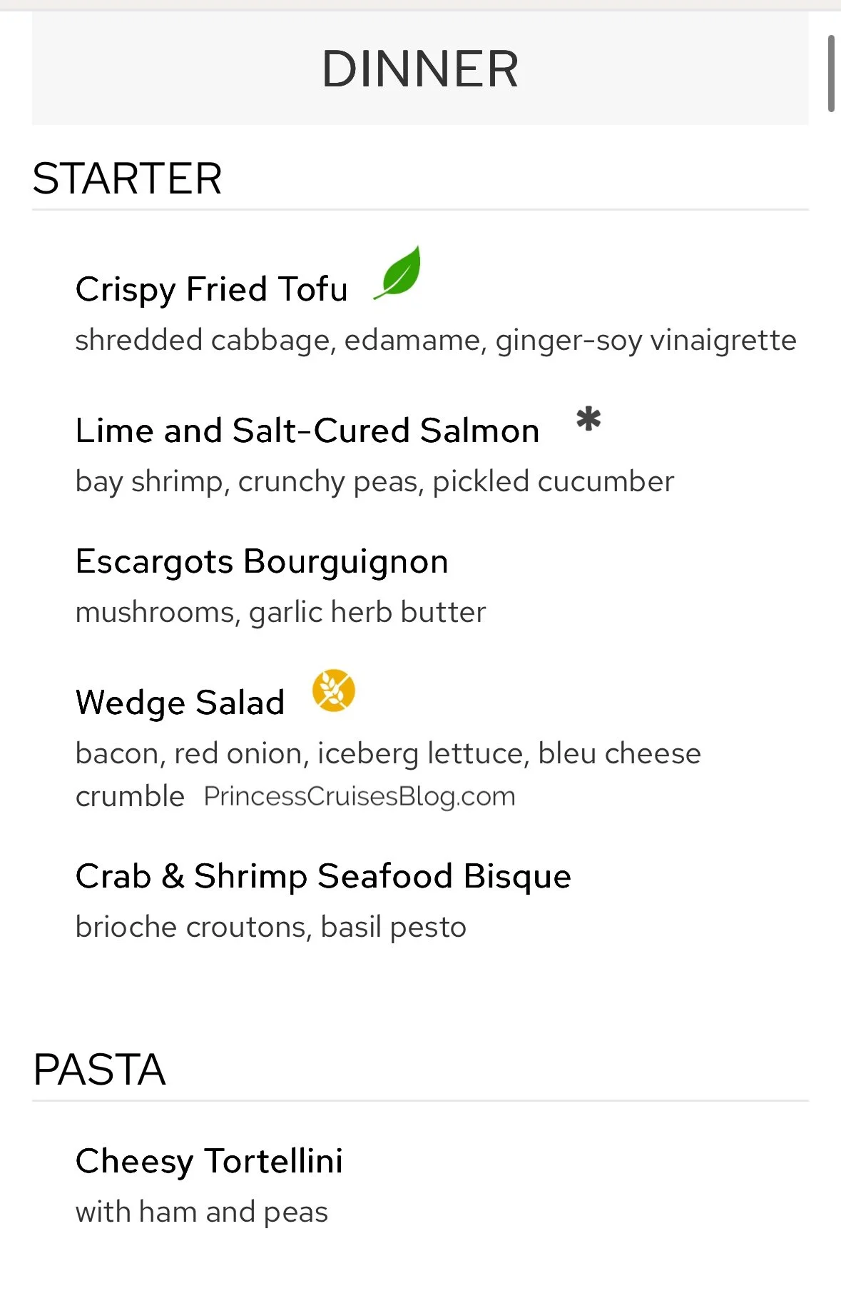 The Gala Dinner on Princess Cruises presents a refined dining experience with classic and inventive flavors. Starters include crispy fried tofu, cured salmon with shrimp, escargots bourguignon, wedge salad, and crab & shrimp bisque. A cheesy tortellini pasta leads to mains like mushroom mascarpone crêpes, pan-seared snapper, seared duck breast, and a “Land & Sea” beef tenderloin with lobster tail. Desserts feature indulgent options such as the Princess Love Boat Dream, lychee raspberry mousse, chocolate pistachio cake, Crêpes Suzette, crème brûlée, cheesecake, and sugar-free delights, offering a perfect sweet ending for all tastes.