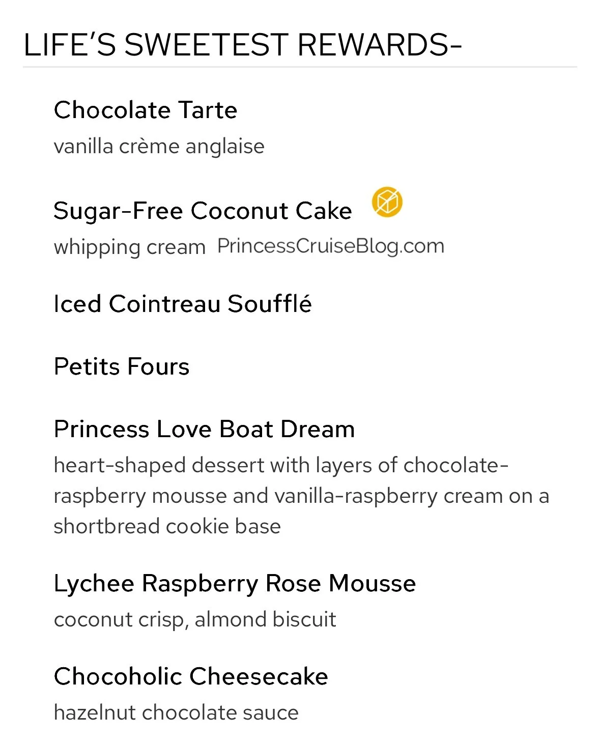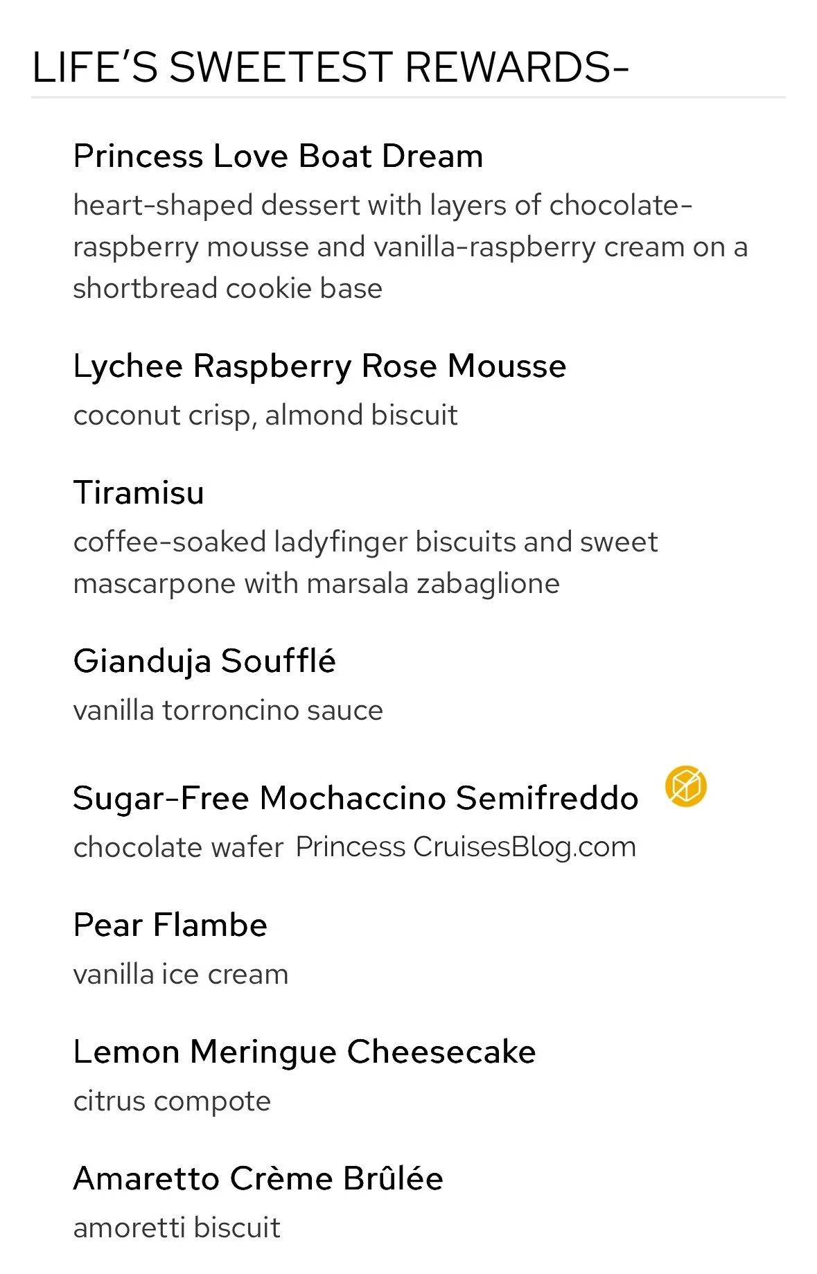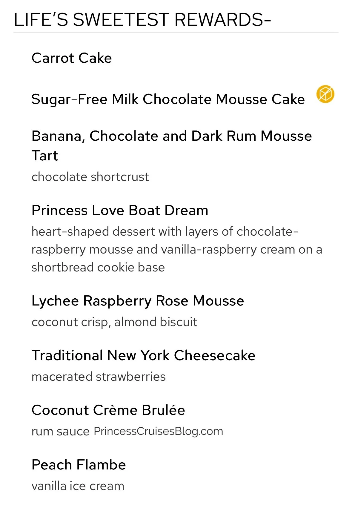 The Gala Dinner on Princess Cruises presents a refined dining experience with classic and inventive flavors. Starters include crispy fried tofu, cured salmon with shrimp, escargots bourguignon, wedge salad, and crab & shrimp bisque. A cheesy tortellini pasta leads to mains like mushroom mascarpone crêpes, pan-seared snapper, seared duck breast, and a “Land & Sea” beef tenderloin with lobster tail. Desserts feature indulgent options such as the Princess Love Boat Dream, lychee raspberry mousse, chocolate pistachio cake, Crêpes Suzette, crème brûlée, cheesecake, and sugar-free delights, offering a perfect sweet ending for all tastes.