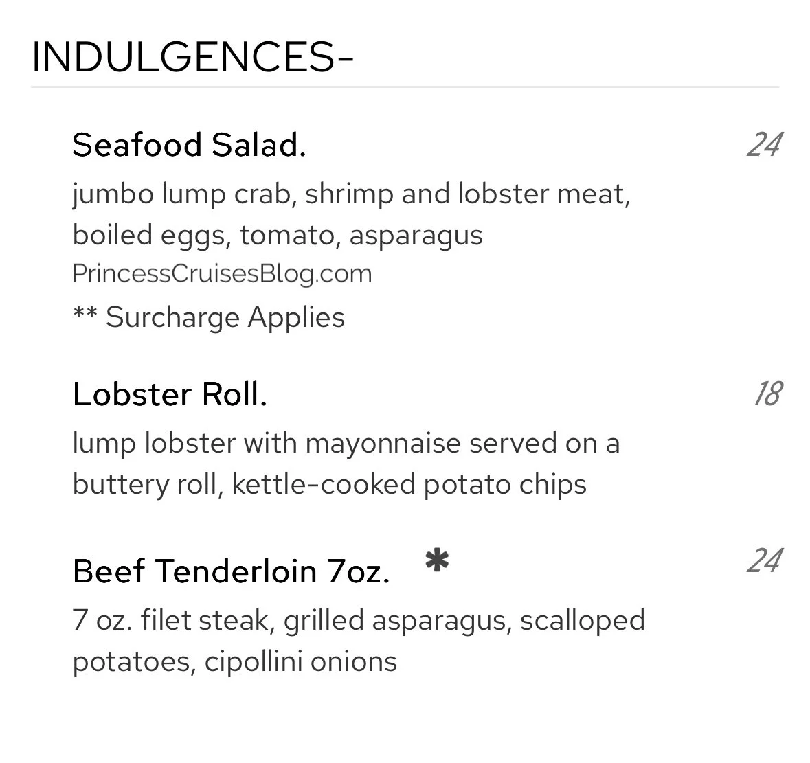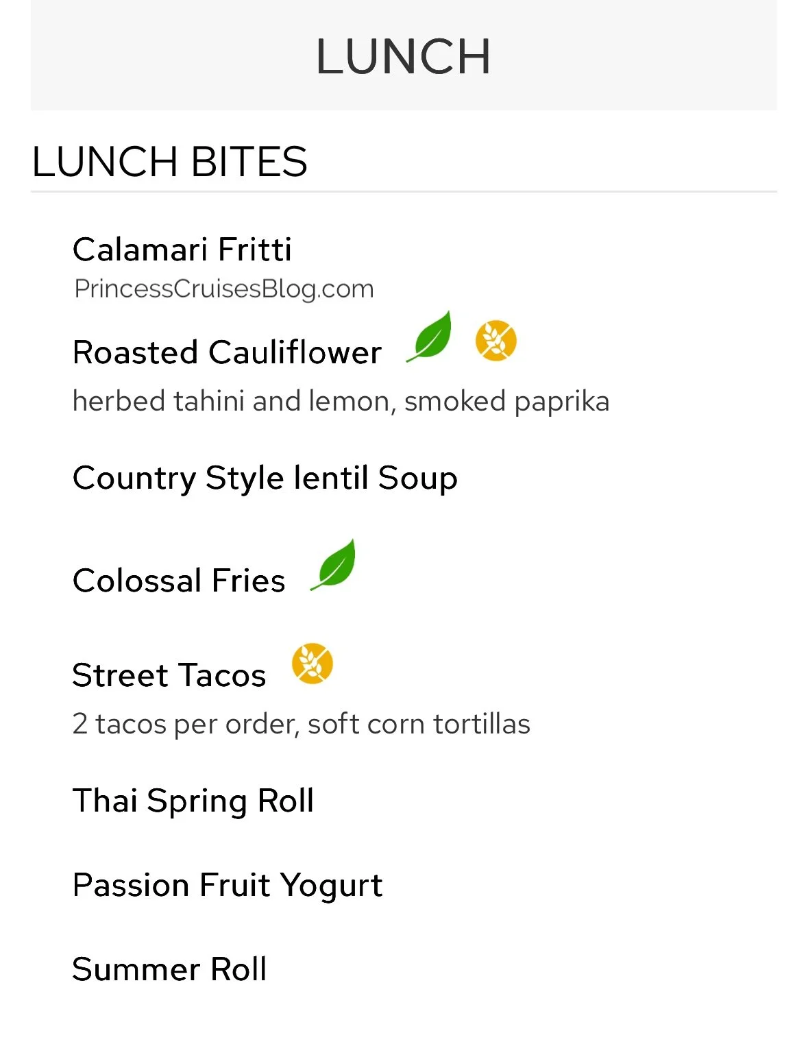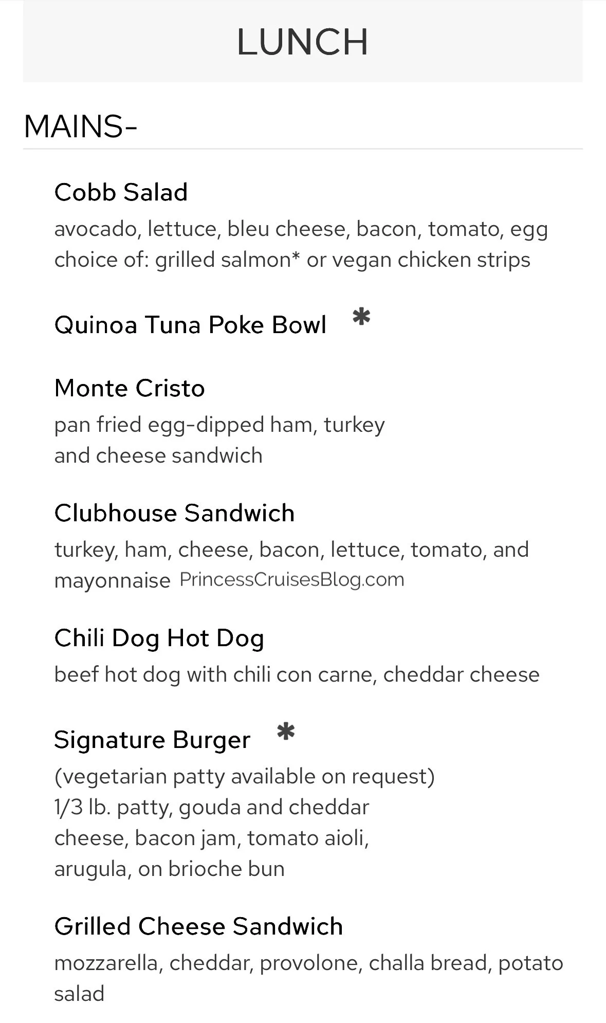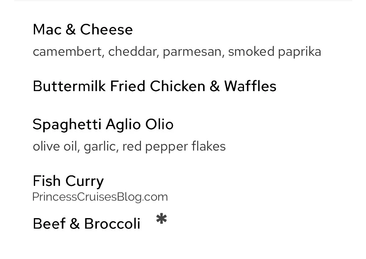 The standard main dining room lunch menu on Princess Cruises offers a diverse selection to satisfy every appetite. Starters include flavorful options like roasted cauliflower, calamari fritti, street tacos, and hearty colossal fries. Main courses feature comfort favorites such as Monte Cristo sandwiches, mac and cheese, and buttermilk fried chicken with waffles, alongside lighter choices like quinoa tuna poke bowls, Cobb salads, and spaghetti aglio olio. Guests can also opt for premium indulgences like a seafood salad, lobster roll, or grilled beef tenderloin for a surcharge. To finish, desserts range from New York cheesecake and double chocolate tart to ice cream and build-your-own sundaes, ensuring a sweet end to the meal.