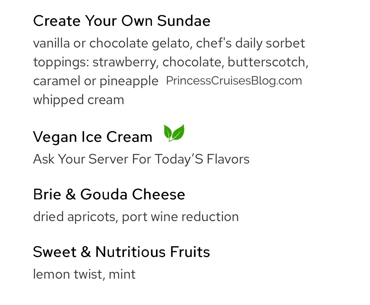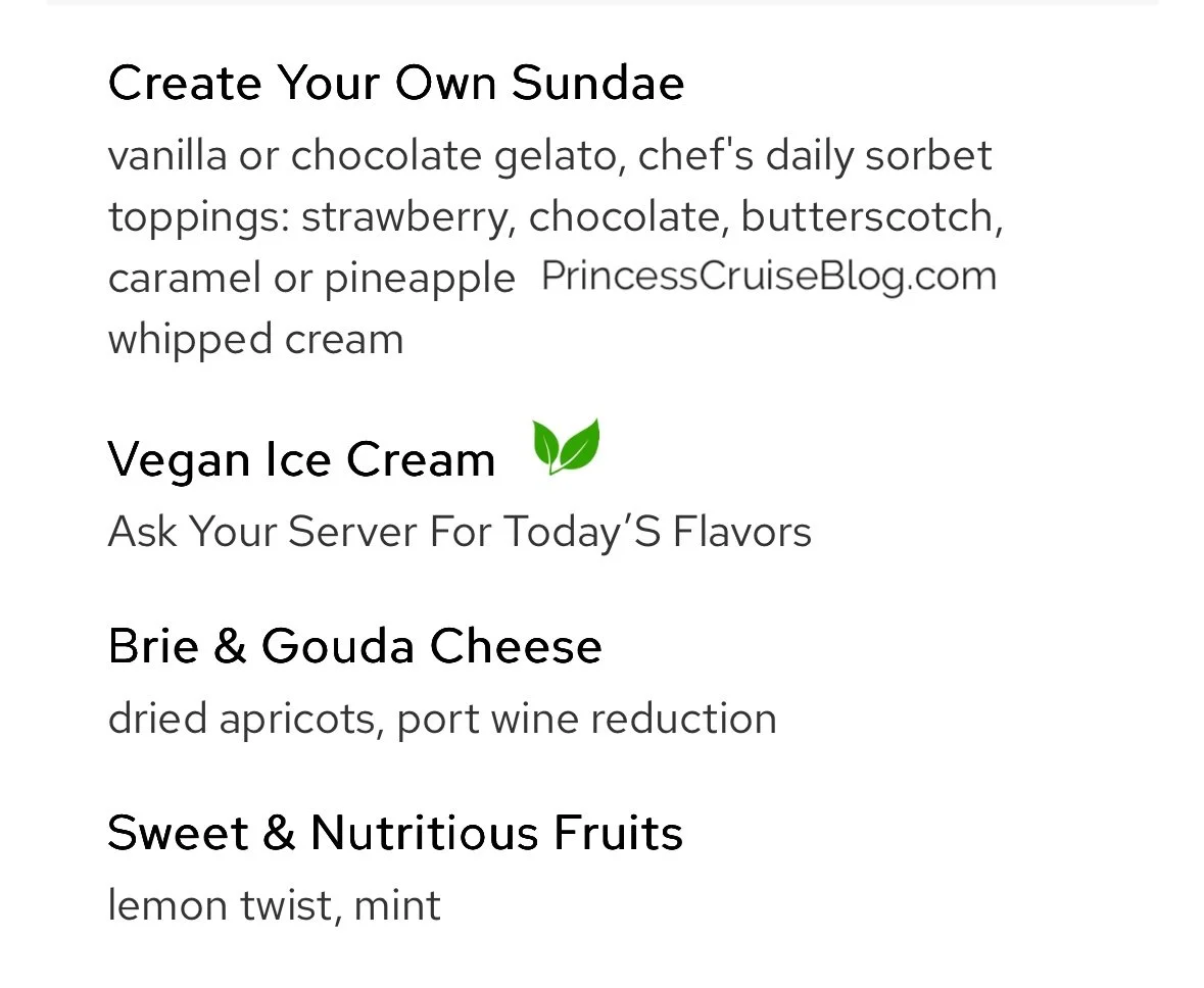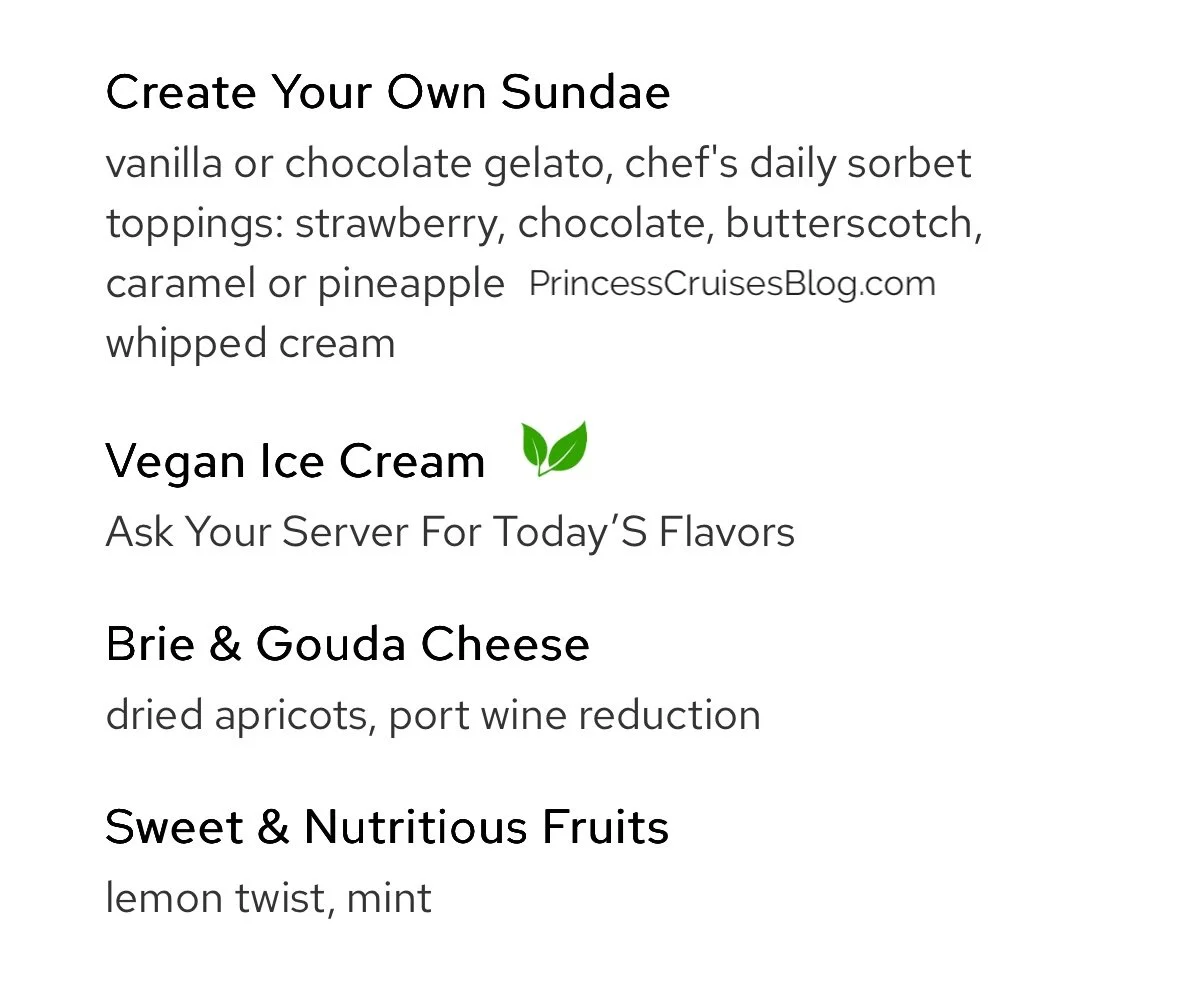 The Night 4 Italian Dinner aboard Princess Cruises features a Mediterranean-inspired menu with a range of vibrant flavors. Starters include prosciutto with melon, seafood antipasto, and vegetarian-friendly options like minestrone soup and insalata mista. Pasta selections feature Mama’s meat lasagna and wild mushroom lasagna, while main courses include rockfish with eggplant caponata, veal scallopini, shrimp and scallops, and Tuscan-style striploin steak. Classic Princess Favorites like seared salmon and chicken breast are also available. Desserts include tiramisu, Gianduja soufflé, and amaretto crème brûlée, alongside vegan ice cream and seasonal fruit. Guests may also upgrade to filet mignon or lobster tail for an additional charge.