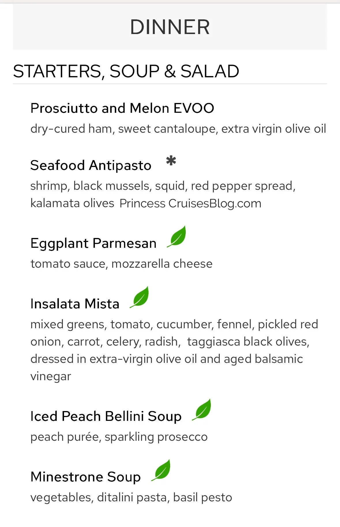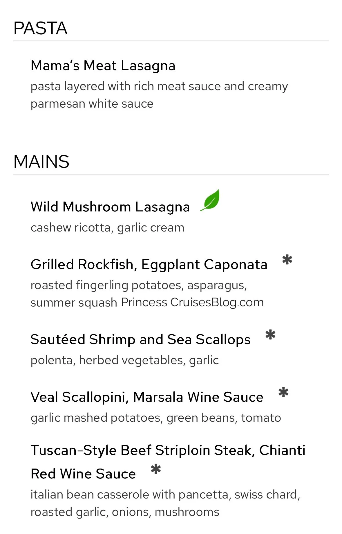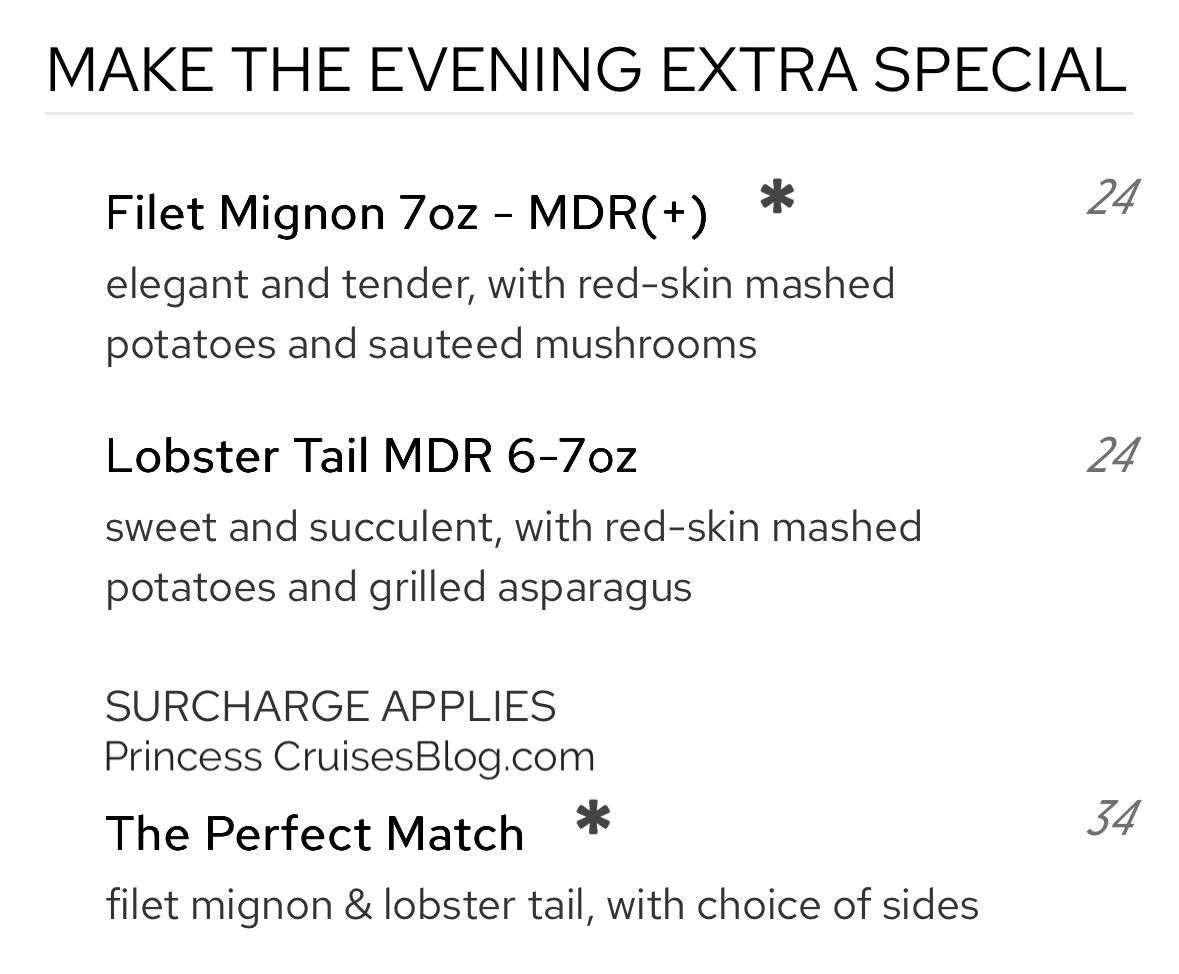 The Night 4 Italian Dinner aboard Princess Cruises features a Mediterranean-inspired menu with a range of vibrant flavors. Starters include prosciutto with melon, seafood antipasto, and vegetarian-friendly options like minestrone soup and insalata mista. Pasta selections feature Mama’s meat lasagna and wild mushroom lasagna, while main courses include rockfish with eggplant caponata, veal scallopini, shrimp and scallops, and Tuscan-style striploin steak. Classic Princess Favorites like seared salmon and chicken breast are also available. Desserts include tiramisu, Gianduja soufflé, and amaretto crème brûlée, alongside vegan ice cream and seasonal fruit. Guests may also upgrade to filet mignon or lobster tail for an additional charge.