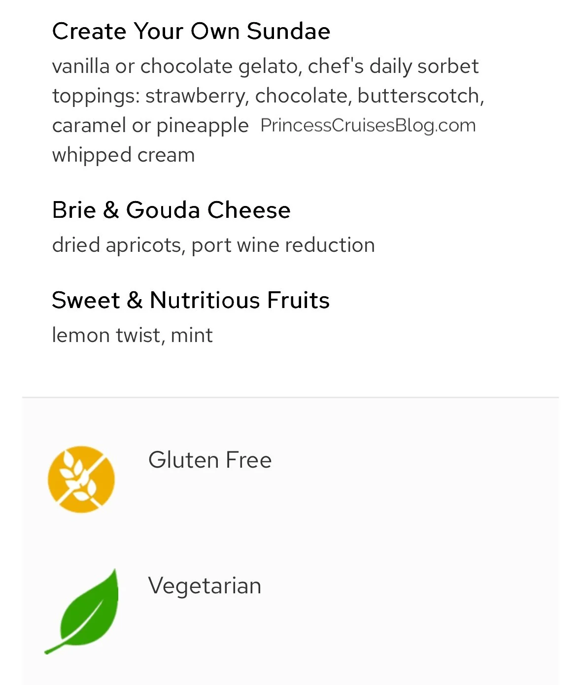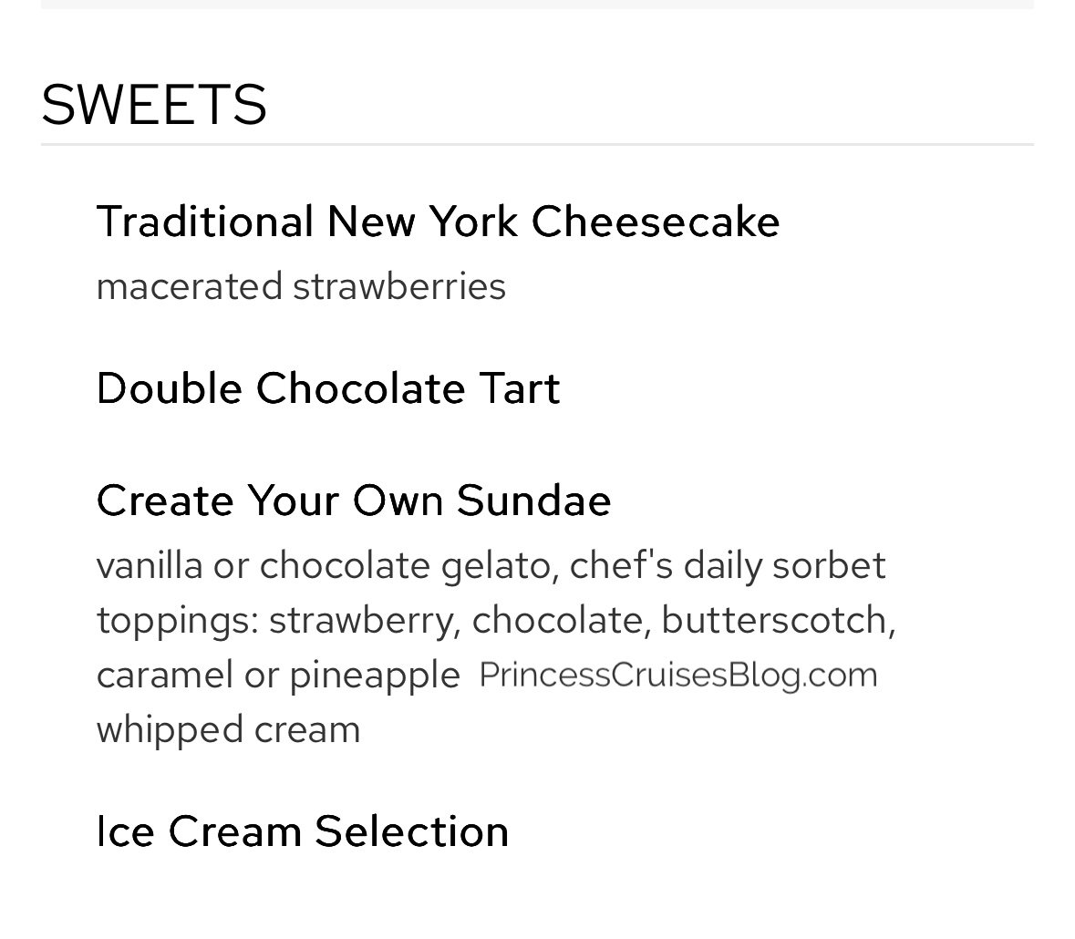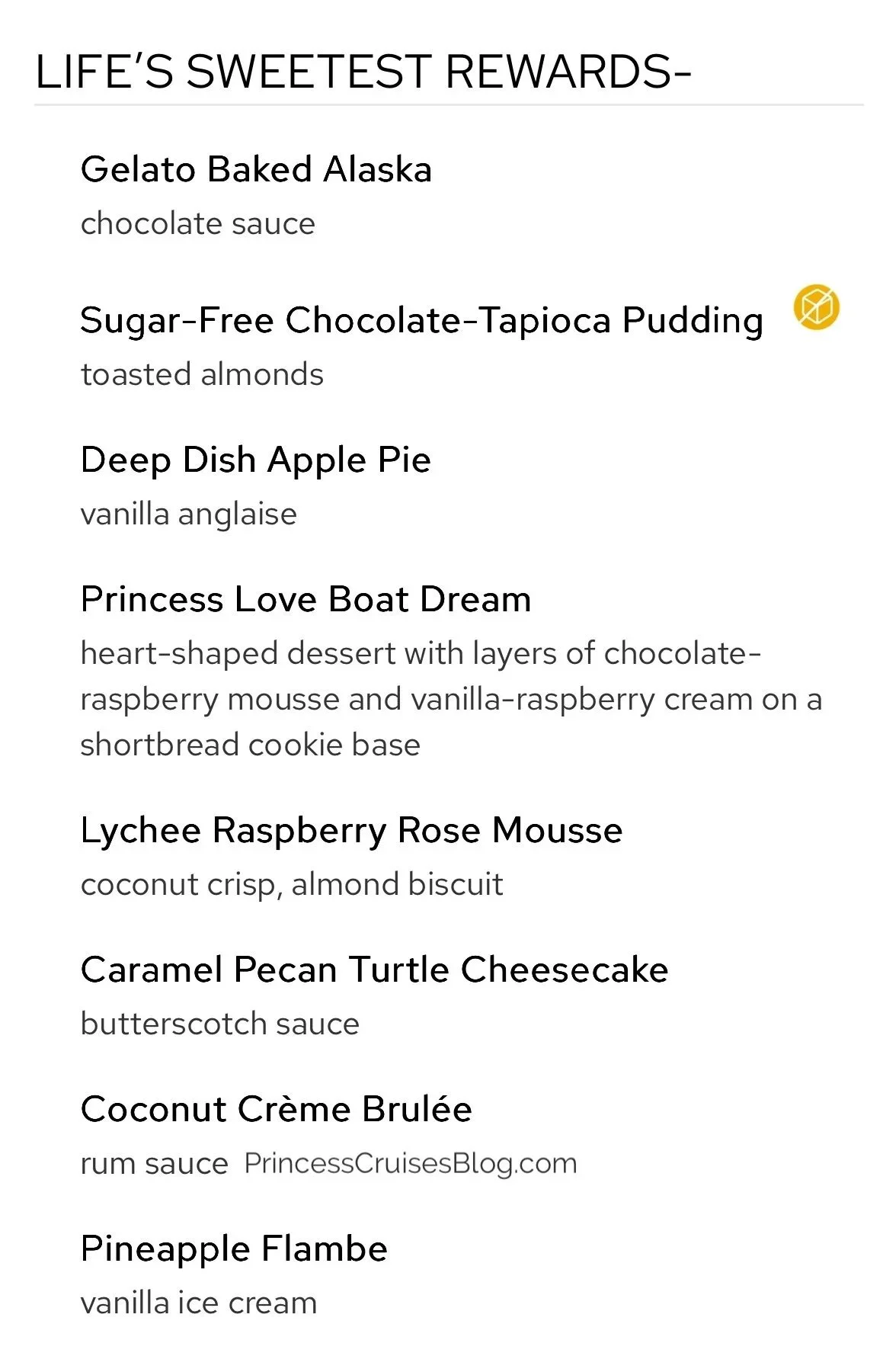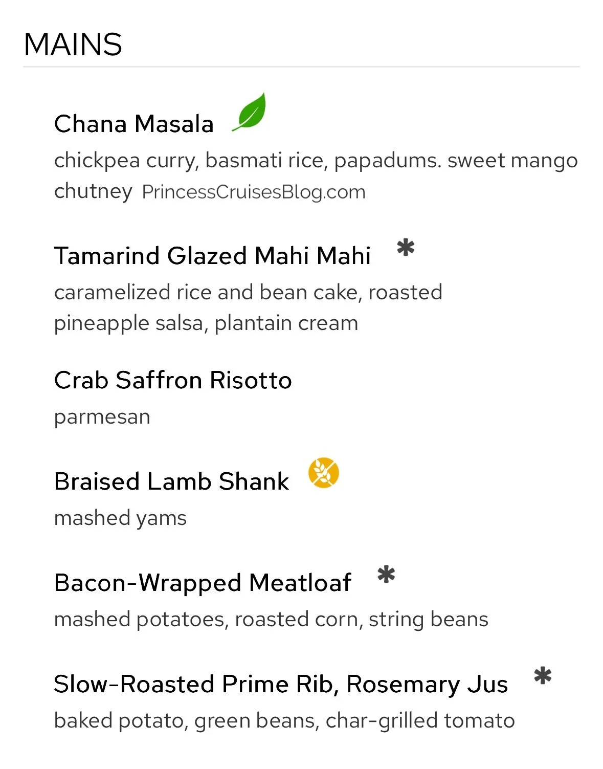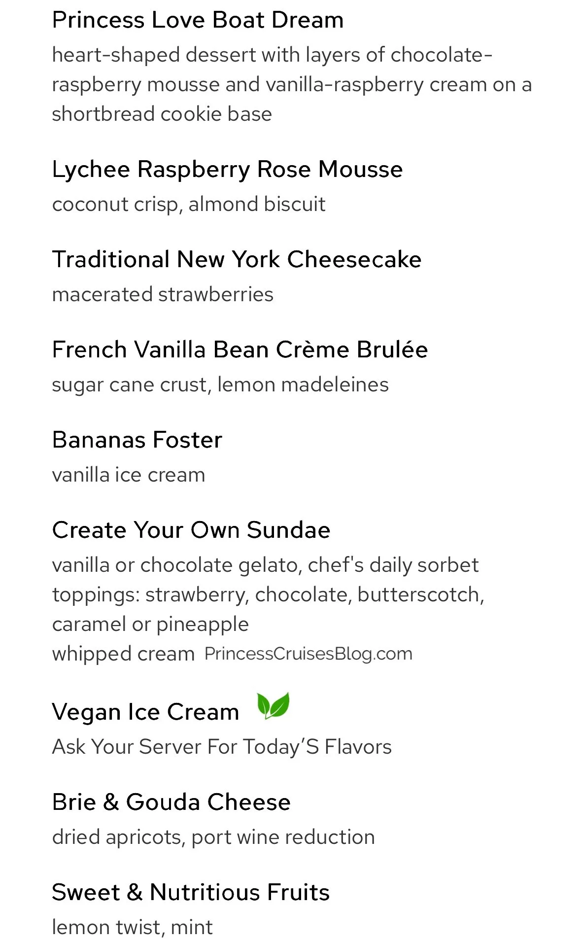 The Farewell Dinner on Princess Cruises features freshly baked breads and starters like watermelon with feta, seafood medley, crispy salmon cakes, and tropical fruit soup. Pasta options include spinach ricotta ravioli and fettuccine Alfredo. Mains range from vegetarian chana masala to tamarind-glazed mahi mahi, crab saffron risotto, braised lamb shank, bacon-wrapped meatloaf, and slow-roasted prime rib. Desserts offer a decadent variety including gelato baked Alaska, deep dish apple pie, the signature Princess Love Boat Dream, plus sugar-free pudding, cheesecake, crème brûlée, sundaes, pineapple flambe, and cheese and fruit selections for a perfect farewell feast.