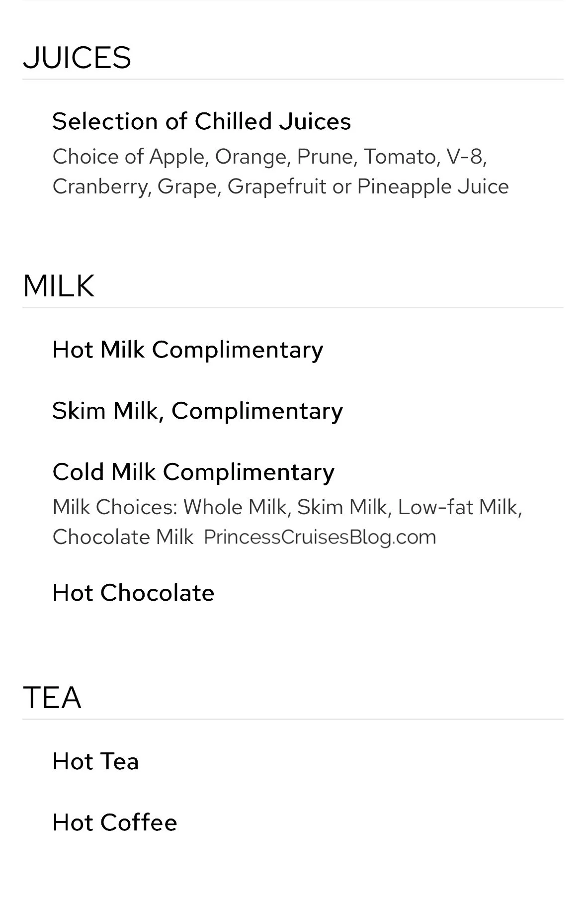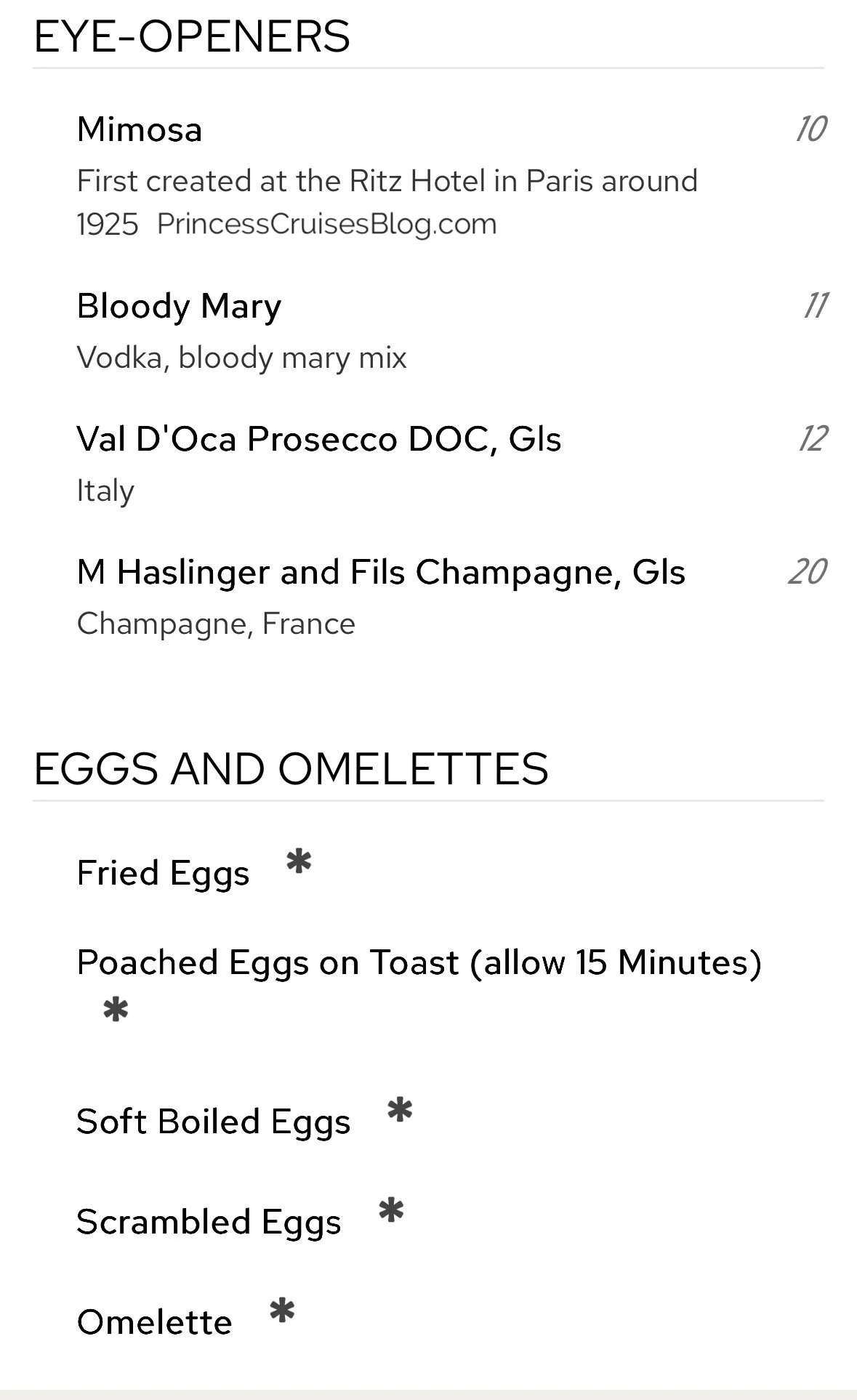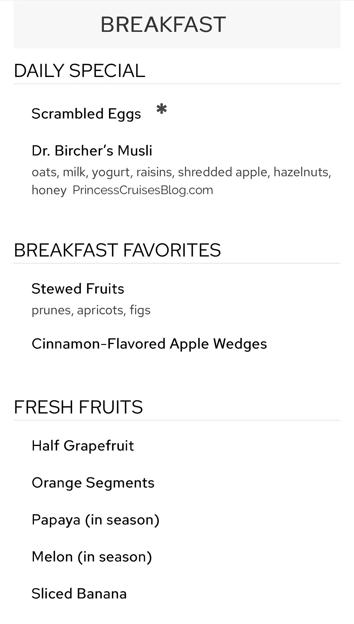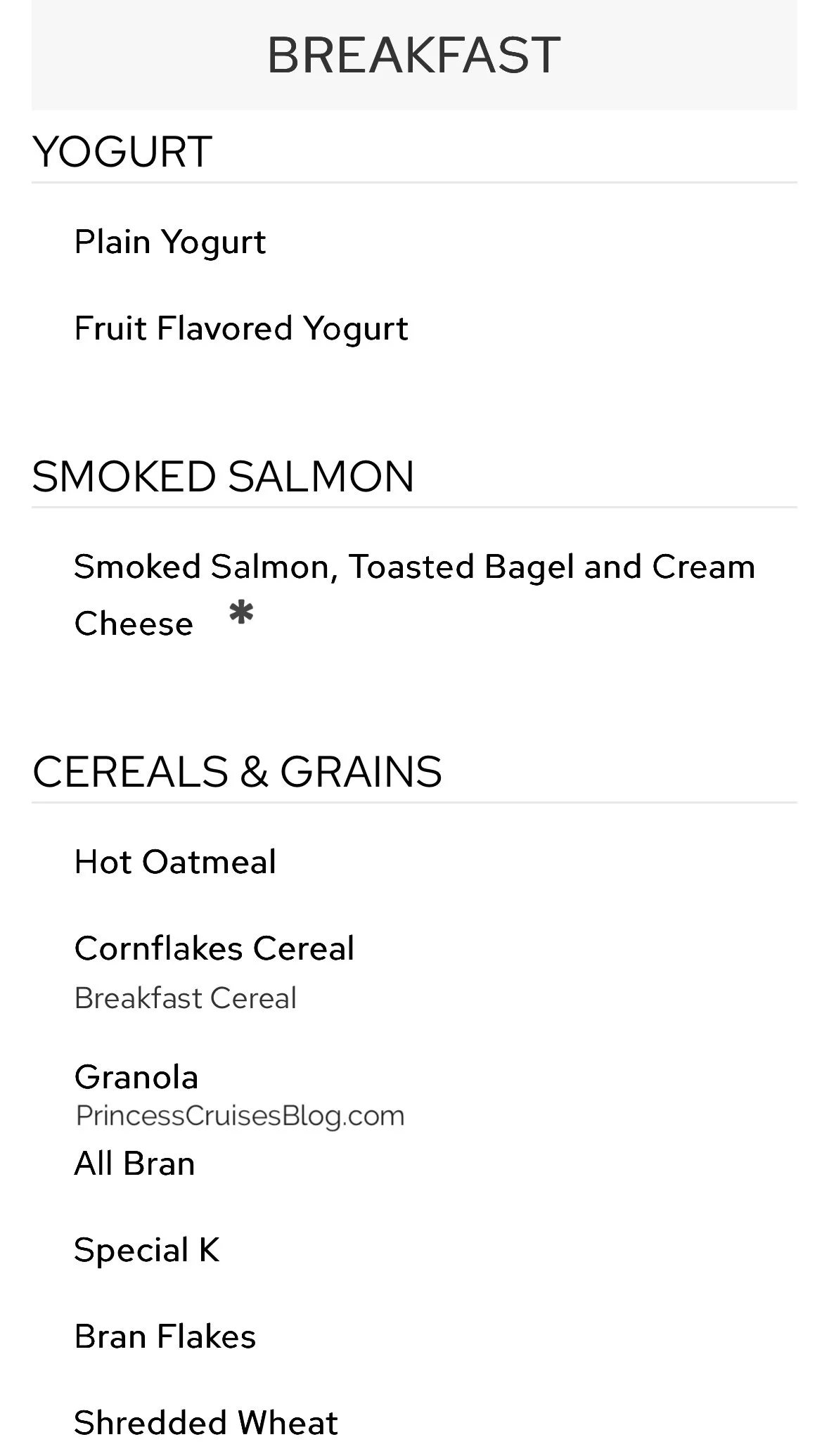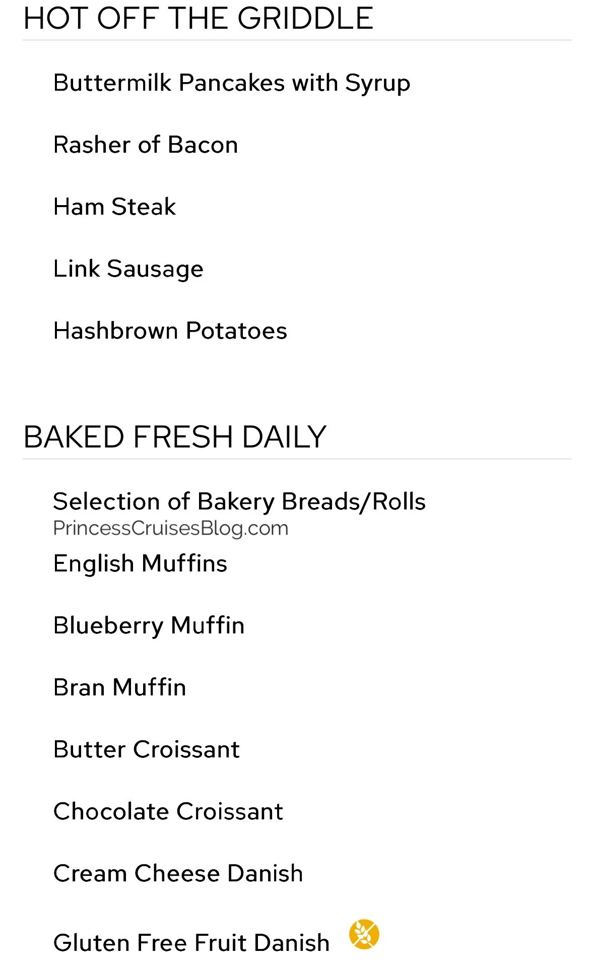 The Princess Cruises breakfast menu offers a wide variety of options to suit every preference. Guests can enjoy classics like scrambled eggs, fried eggs, omelets, pancakes, bacon, and sausage, along with lighter choices such as yogurt, cereal, muesli, and fresh or stewed fruits. Breads and pastries are baked fresh daily, including muffins, croissants, and gluten-free danishes. Smoked salmon with a toasted bagel is also available, as are hot oatmeal, granola, and multiple milk and juice selections. For an indulgent start, eye-openers like mimosas and Bloody Marys are offered.