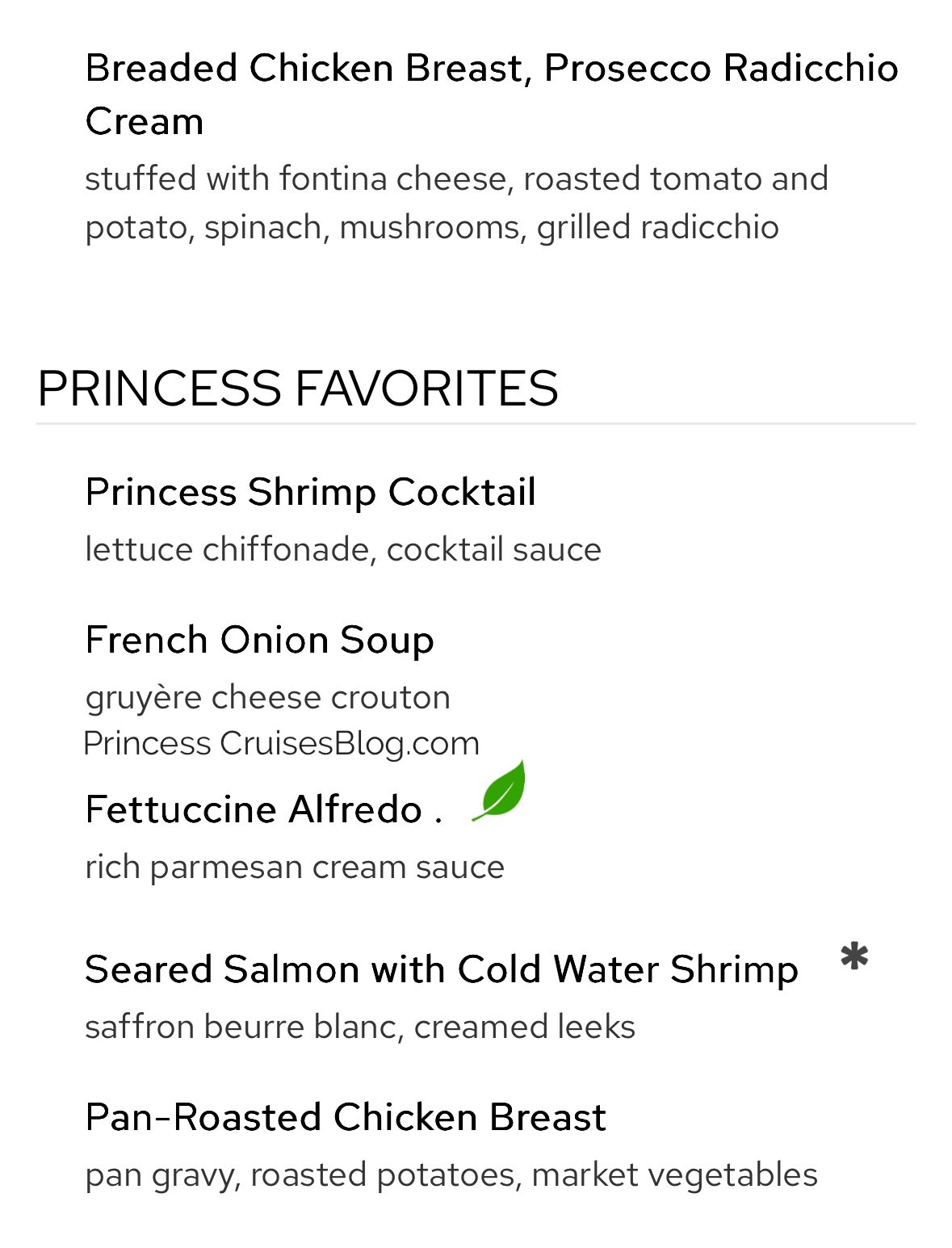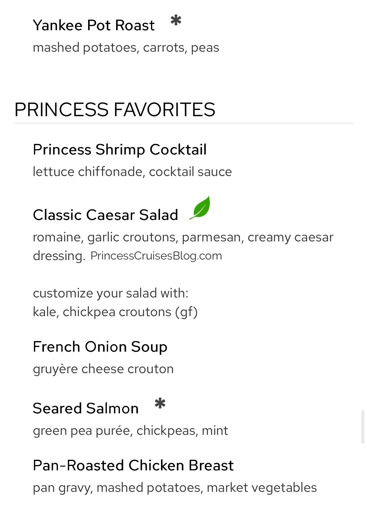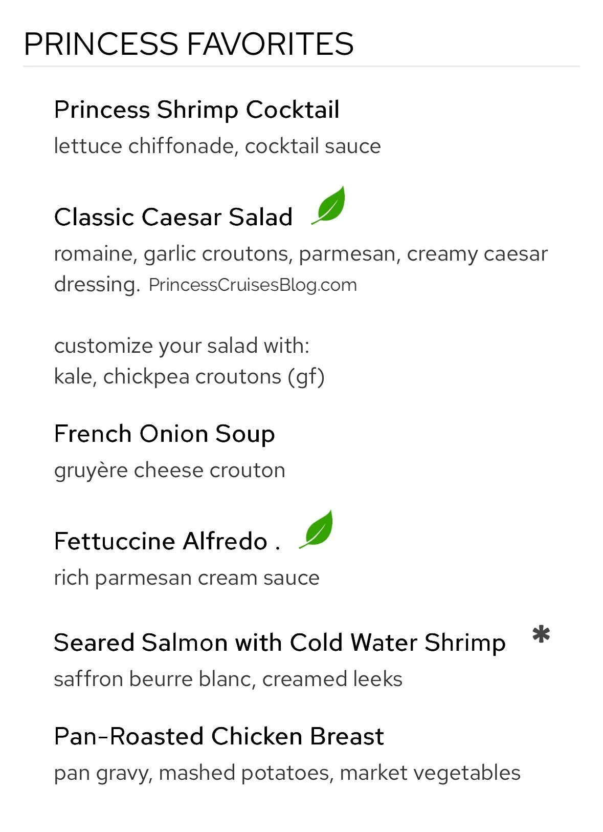 The Night 1 “Welcome Aboard” dinner on Princess Cruises features a wide variety of options, including seafood, chicken, pork, vegetarian, and vegan dishes. Starters range from ceviche to black bean soup, with salads and antipasto available. Entrées include Cajun fried chicken, mahi mahi, and risotto. Guests can also choose premium options like filet mignon or lobster tail for an added charge, followed by classic desserts.