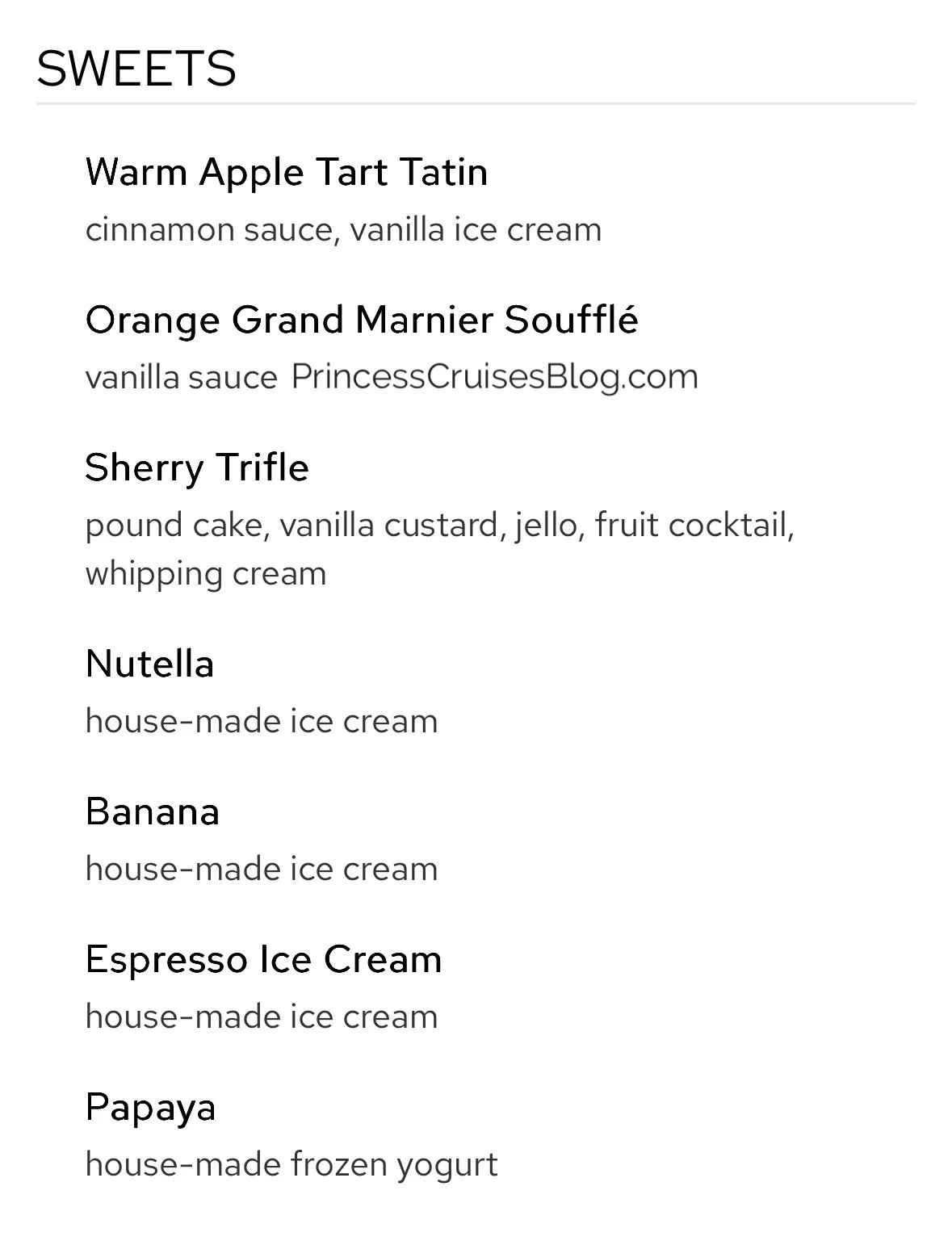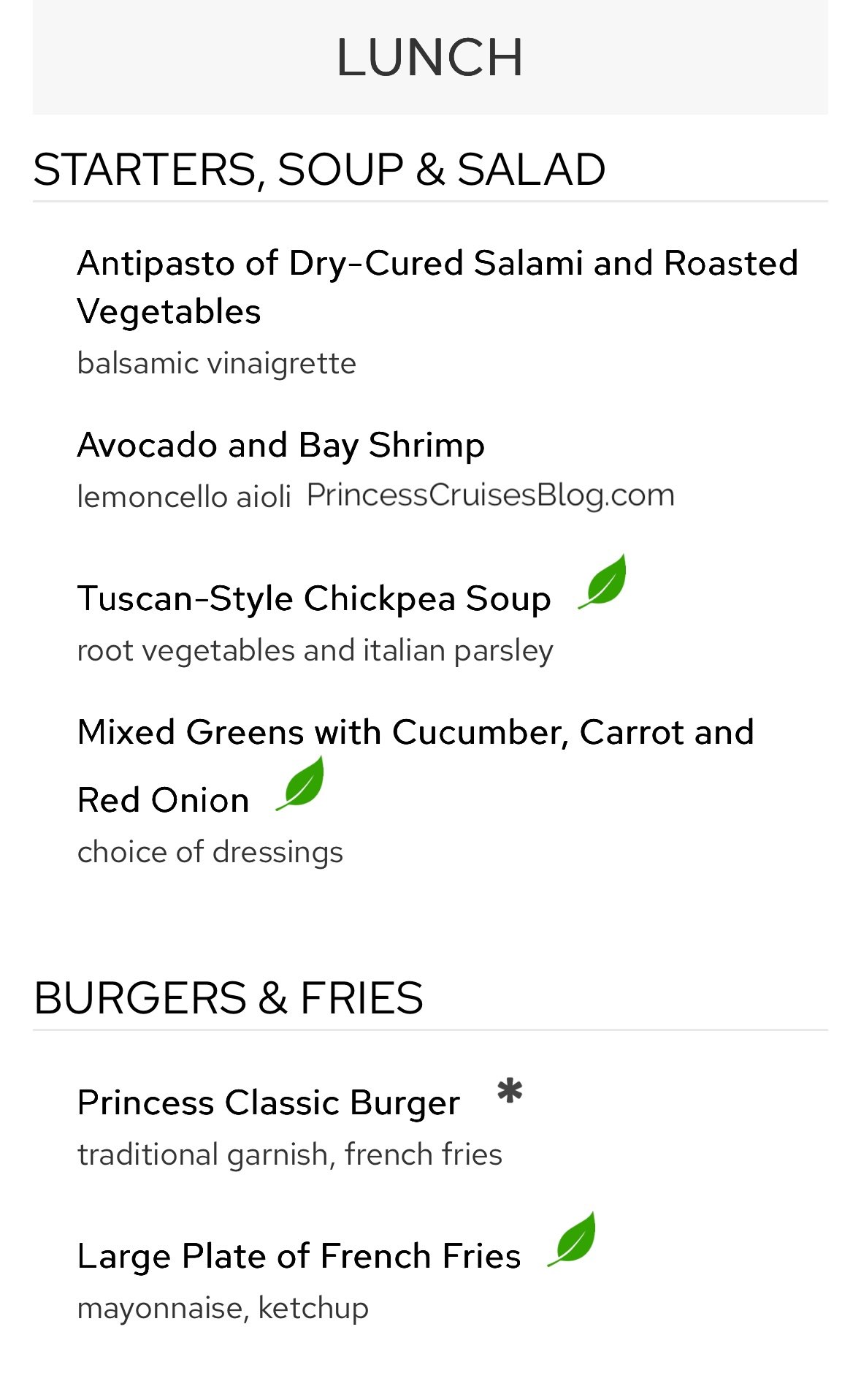The embarkation day lunch on Princess Cruises offers a relaxed yet satisfying selection to kick off your voyage. Starters include antipasto, avocado and shrimp, chickpea soup, and mixed greens. Guests can opt for comfort favorites like the Princess Classic Burger and fries or go lighter with spinach and ricotta ravioli. Main courses include broiled salmon, cacciatore-style chicken, and grilled beef tenderloin. For dessert, the menu features warm apple tart, Grand Marnier soufflé, sherry trifle, and house-made ice creams in flavors like Nutella, espresso, and banana, plus frozen yogurt.