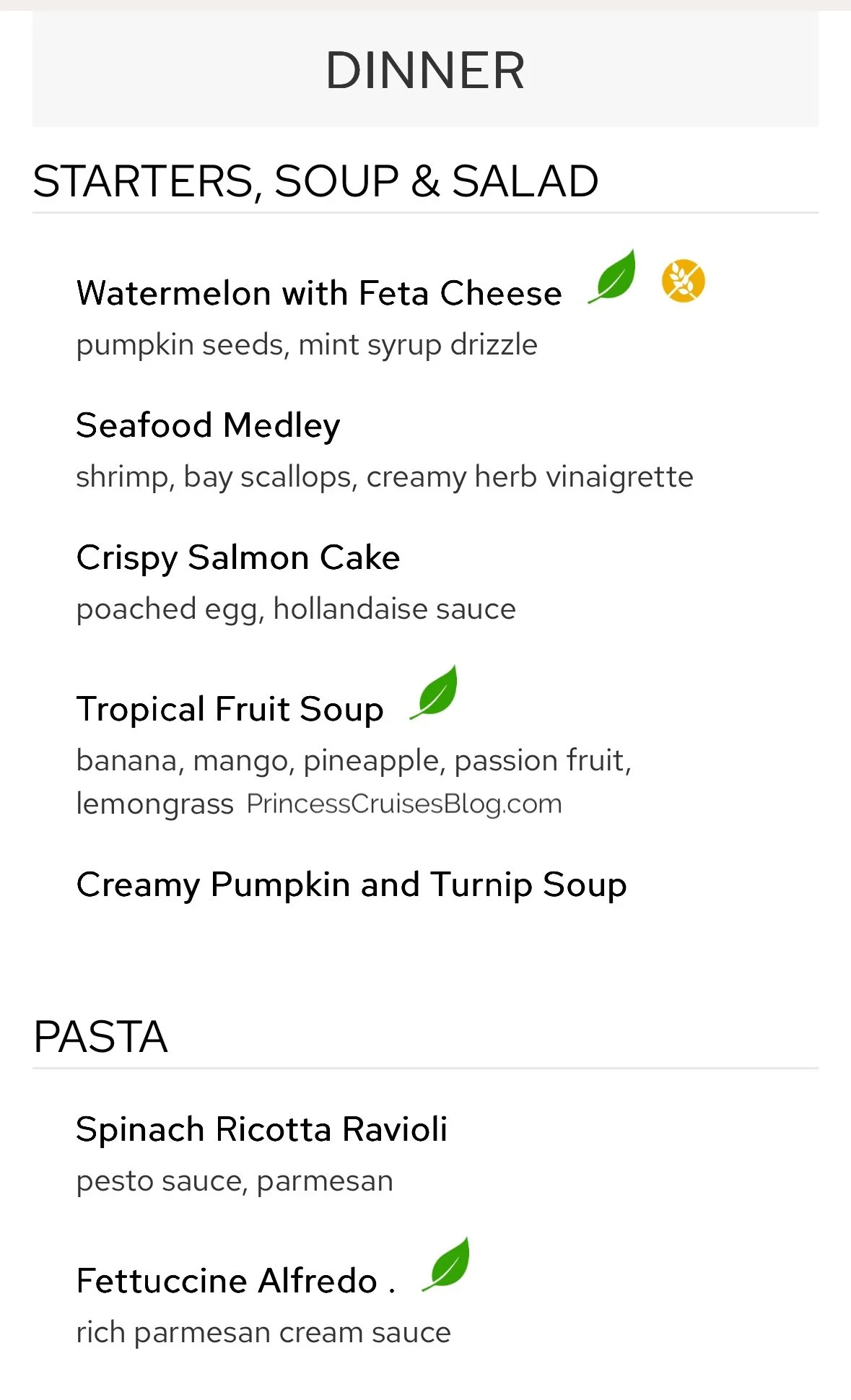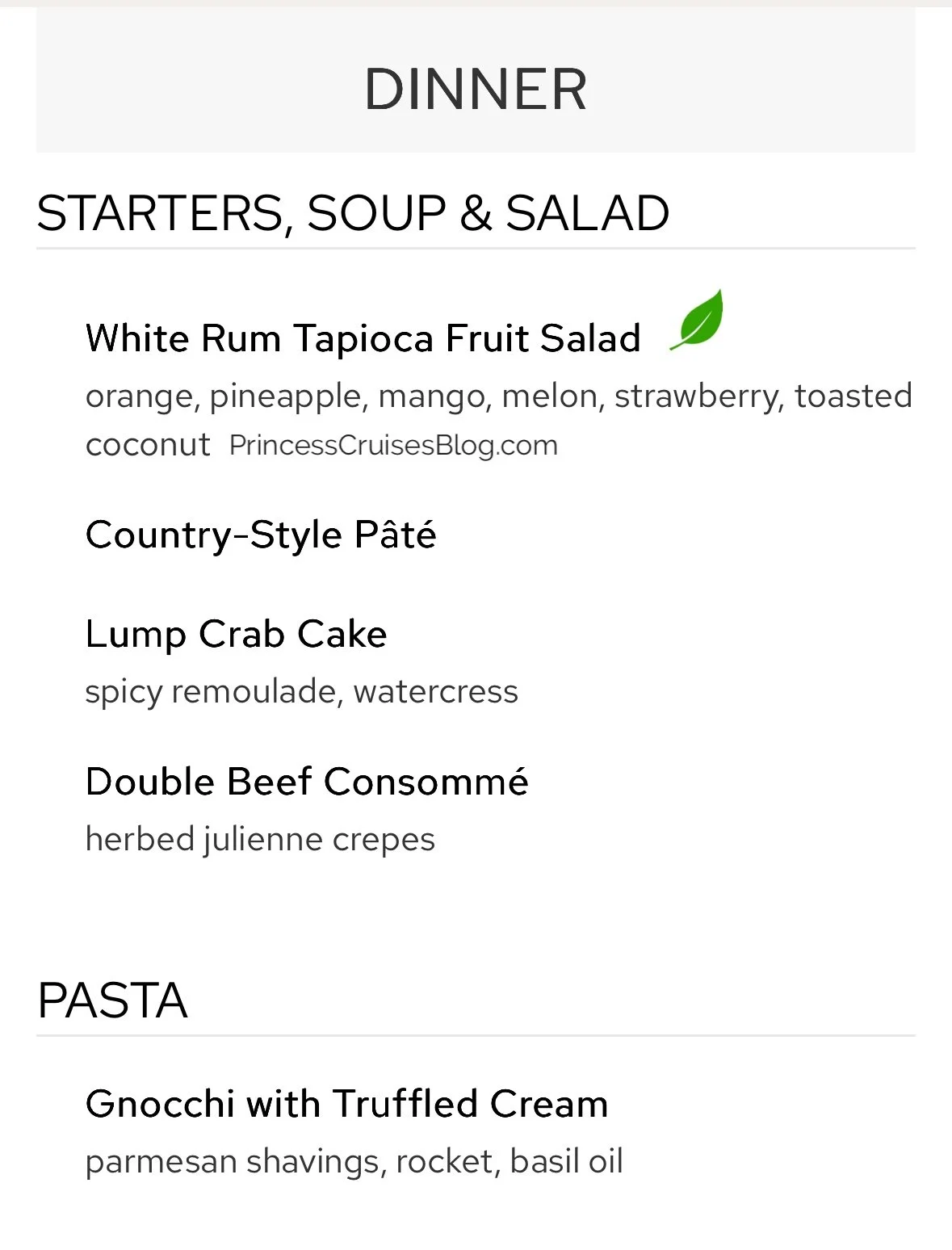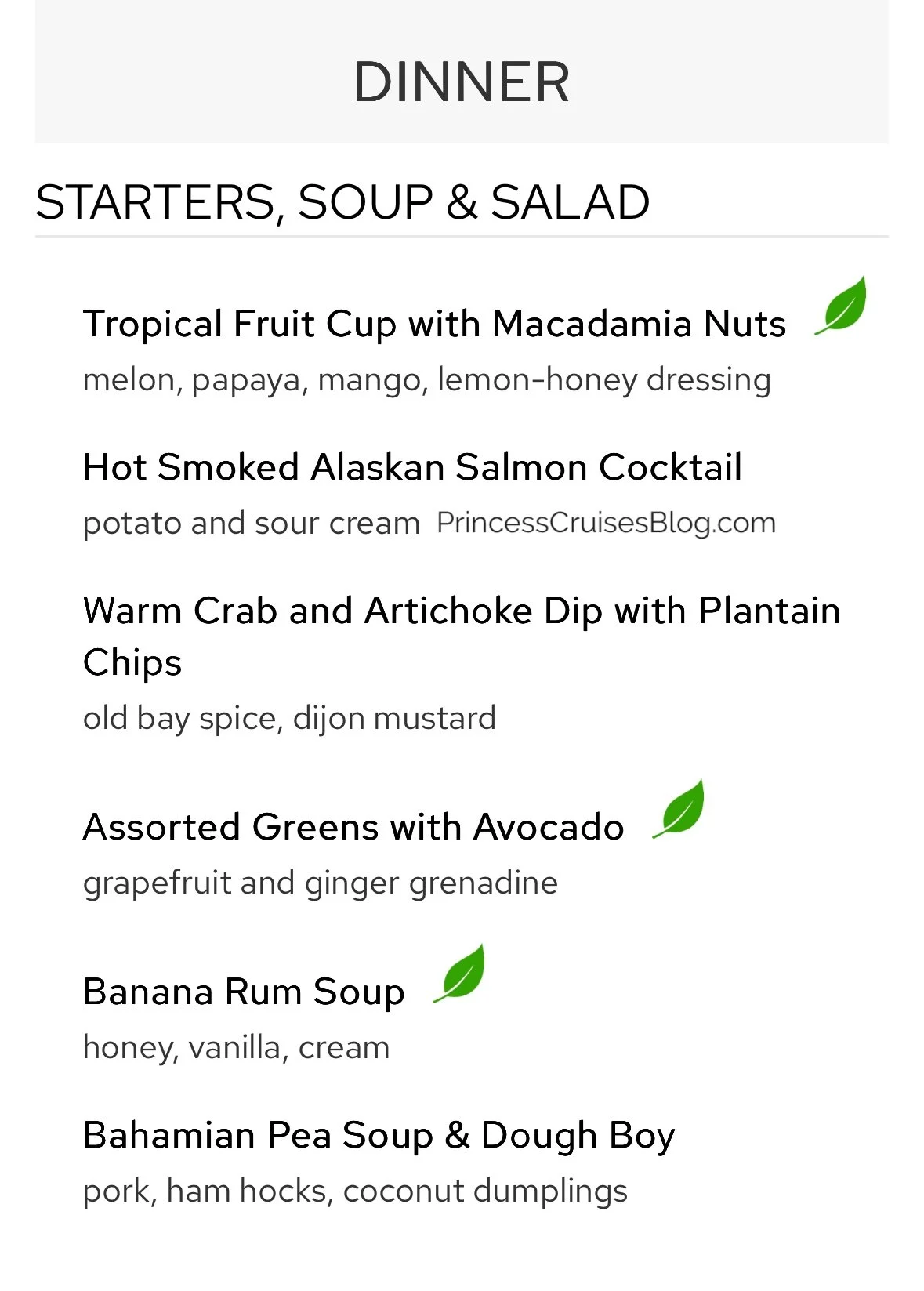 The Night 2 Caribbean dinner in the main dining room aboard Princess Cruises continues to offer a diverse and flavorful selection. Starters include tropical fruit with macadamia nuts, warm crab dip, and banana rum soup, with multiple vegetarian options clearly marked. Pasta lovers can enjoy Penne alla Vodka or Fettuccine Alfredo, while mains range from pan-seared corvina and grilled seafood to jerk chicken, pork loin, and beef stroganoff. Classic Princess Favorites like Caesar salad and French onion soup return, and premium upgrades such as filet mignon or lobster tail are available. Dessert options include mousse, cheesecake, crème brûlée, and a vegan ice cream selection.