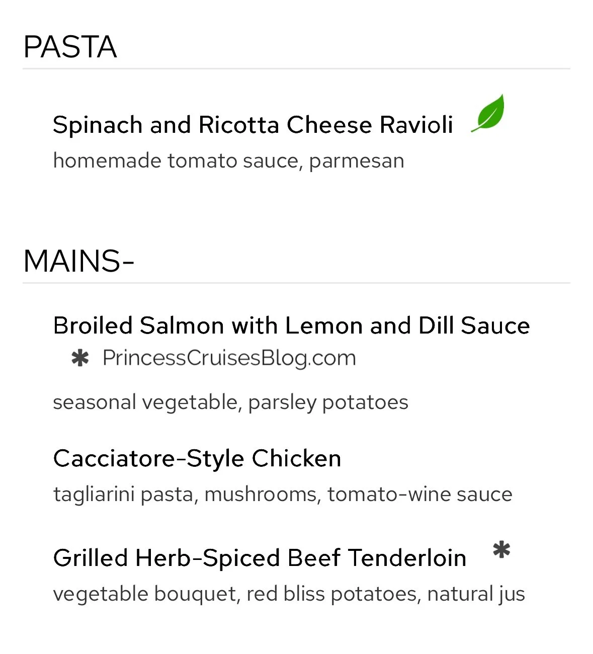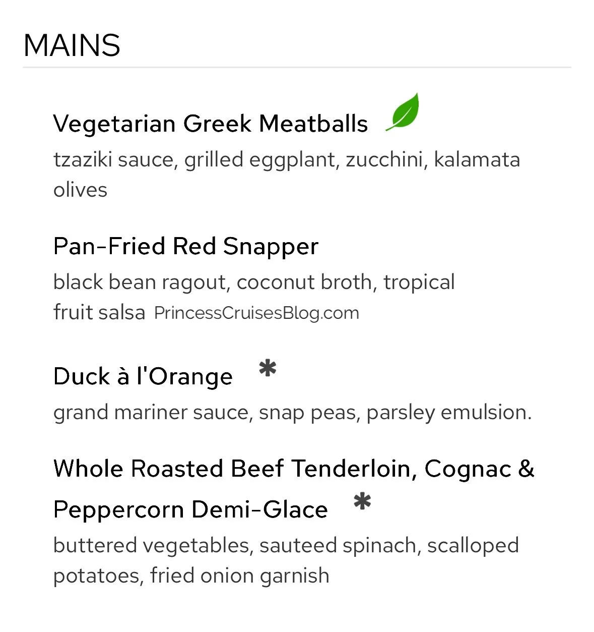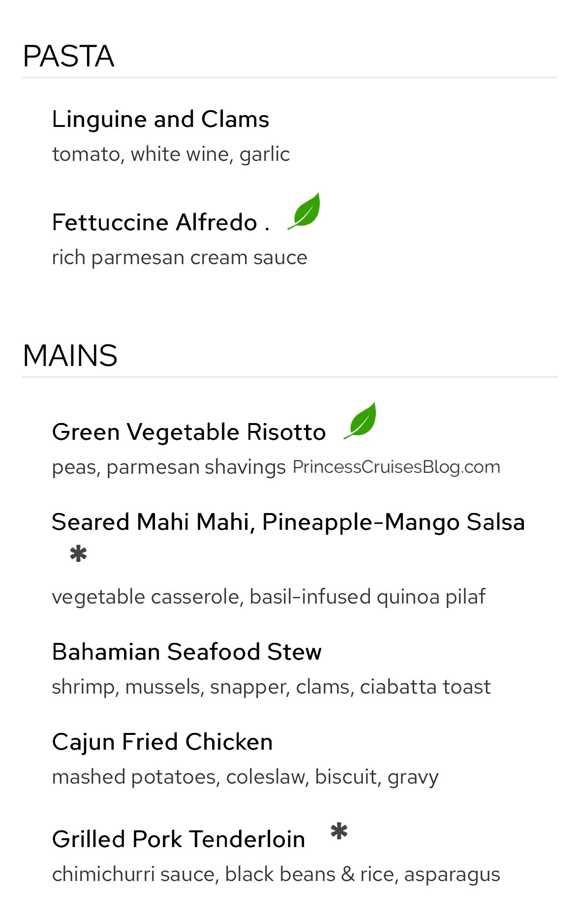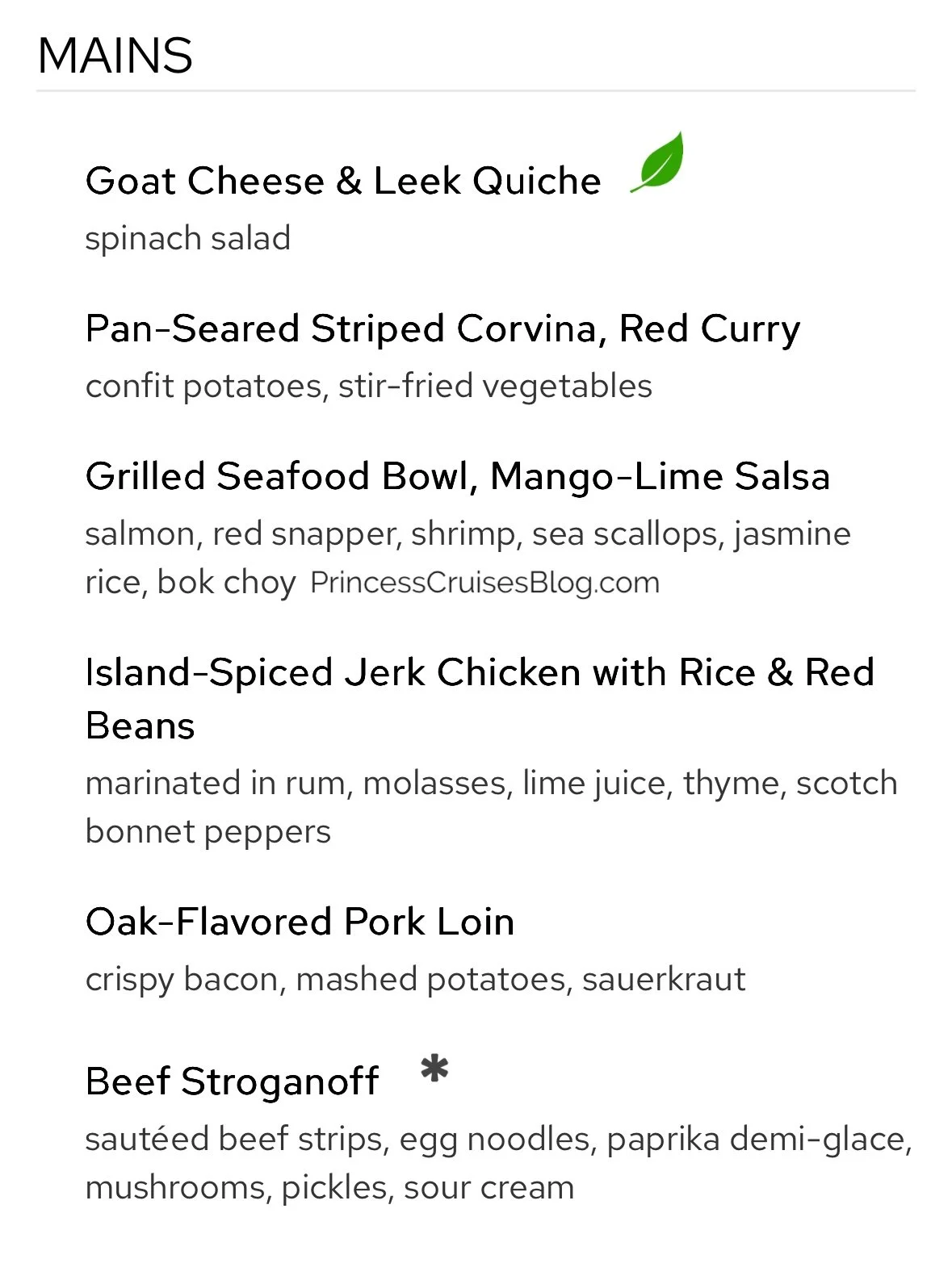 The Night 2 Caribbean dinner in the main dining room aboard Princess Cruises continues to offer a diverse and flavorful selection. Starters include tropical fruit with macadamia nuts, warm crab dip, and banana rum soup, with multiple vegetarian options clearly marked. Pasta lovers can enjoy Penne alla Vodka or Fettuccine Alfredo, while mains range from pan-seared corvina and grilled seafood to jerk chicken, pork loin, and beef stroganoff. Classic Princess Favorites like Caesar salad and French onion soup return, and premium upgrades such as filet mignon or lobster tail are available. Dessert options include mousse, cheesecake, crème brûlée, and a vegan ice cream selection.