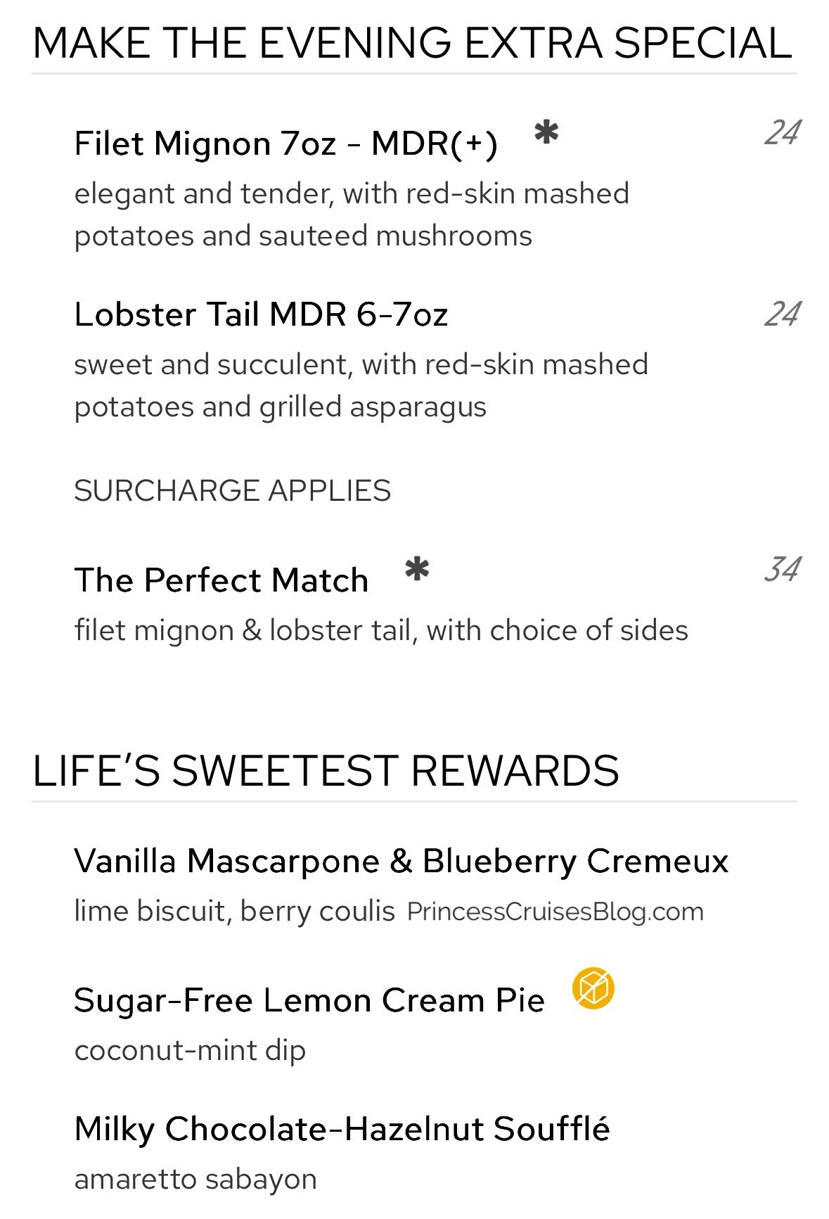 The Night 3 Celebration Dinner aboard Princess Cruises features an elevated menu with elegant options. Starters include white rum tapioca fruit salad, lump crab cake, and double beef consommé, followed by gnocchi with truffled cream. Entrées range from duck à l’orange and beef tenderloin to red snapper and vegetarian Greek meatballs. Princess Favorites like Caesar salad, seared salmon, and chicken breast are also available. Desserts include chocolate hazelnut bar, crêpes Suzette, cheesecake, and the signature Love Boat Dream, with vegan and sugar-free options as well. Premium upgrades like filet mignon and lobster tail are offered for an added charge.