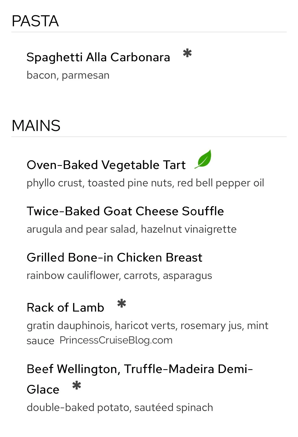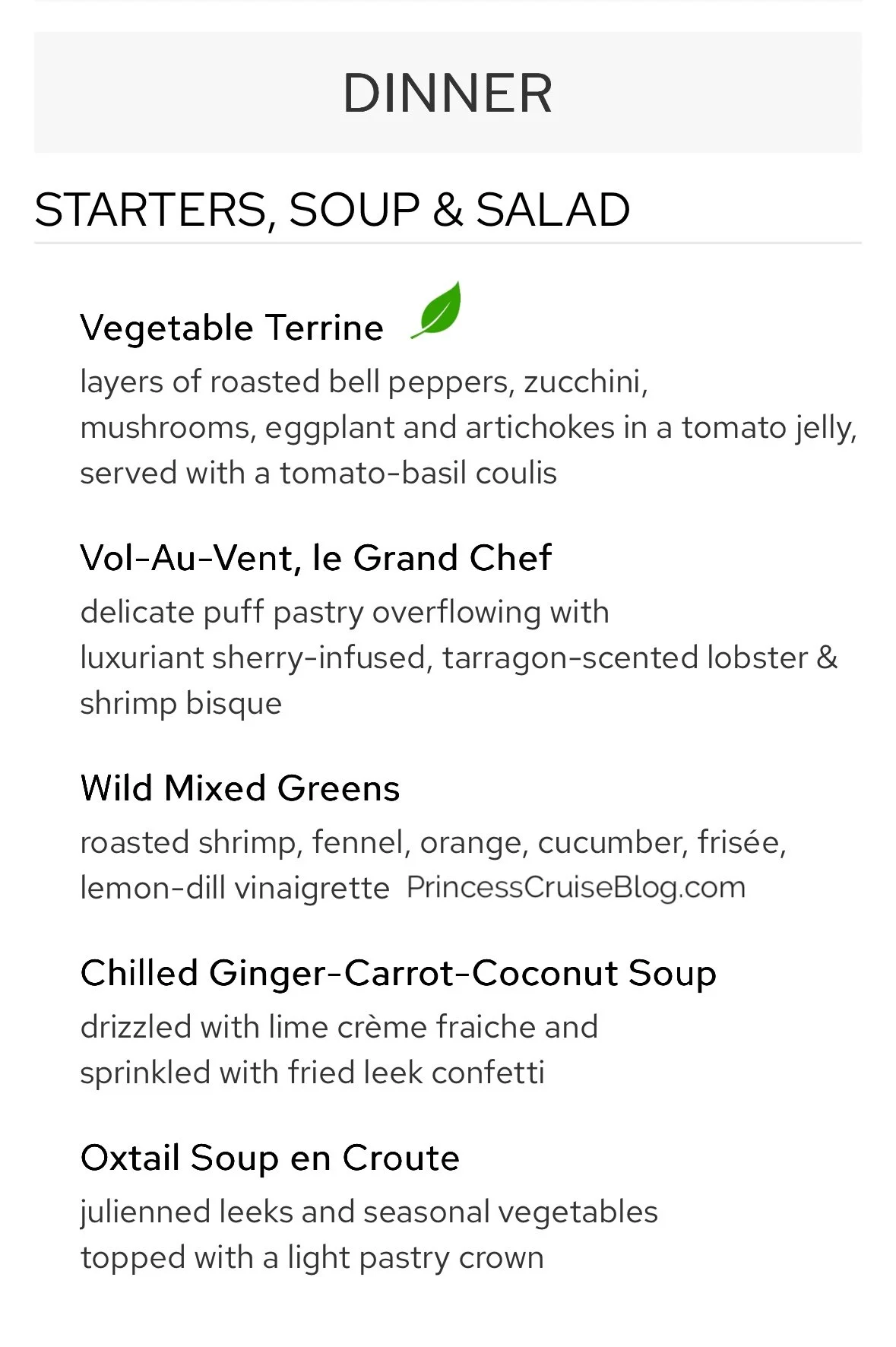The Night 5 Chef’s Dinner on Princess Cruises delivers a refined dining experience with artfully composed selections. Starters include vegetable terrine, wild mixed greens, and chilled ginger-carrot-coconut soup, alongside richer options like shrimp bisque in puff pastry and oxtail soup en croute. Spaghetti alla carbonara is the pasta course, followed by mains such as beef Wellington with truffle demi-glace, rack of lamb, goat cheese soufflé, and oven-baked vegetable tart. Princess Favorites and premium upgrades like filet mignon and lobster tail are also available. For dessert, options range from chocolate tarte and iced Cointreau soufflé to coconut cake and the signature Love Boat Dream.