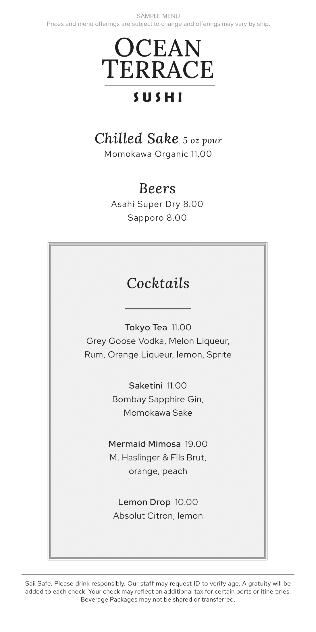 Ocean Terrace’s beverage menu is designed to pair with its sushi and small plates. The selection includes chilled sake, Japanese beers such as Asahi and Sapporo, and a short list of cocktails including sake-based drinks and citrus-forward classics. Guests can also choose from Champagne and sparkling wine, along with white and red wines available by the glass or bottle.