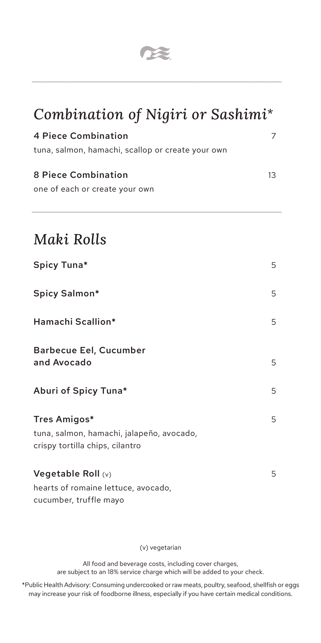 Ocean Terrace is a casual sushi venue onboard Princess Cruises offering a focused menu of sushi and small bites. The menu includes nigiri and sashimi made with tuna, salmon, hamachi, shrimp, and other seafood, along with maki rolls, seaweed salad, edamame, and specialty starters such as hamachi tacos and ceviche. Set menus and à la carte options are available for light meals or sharing.