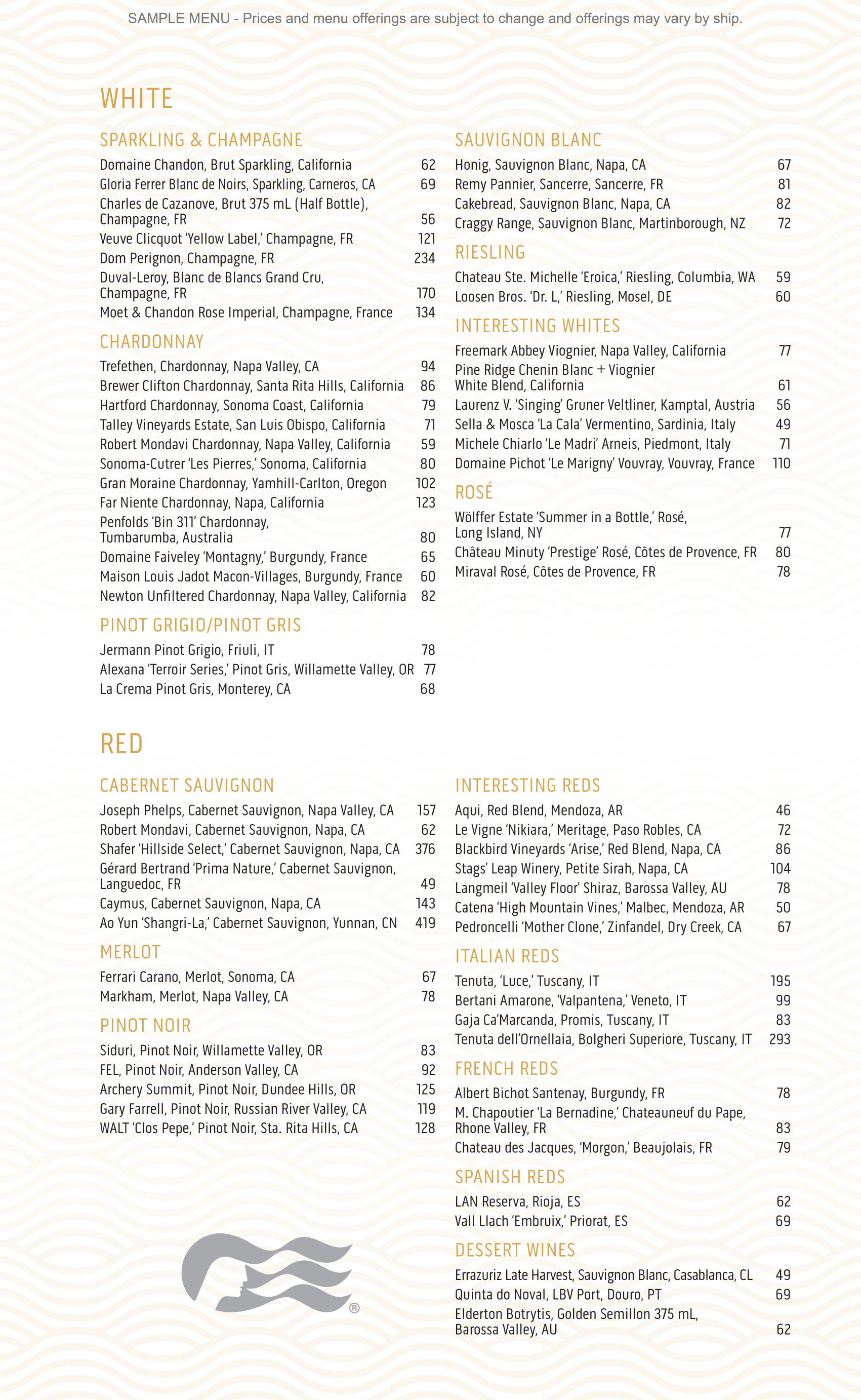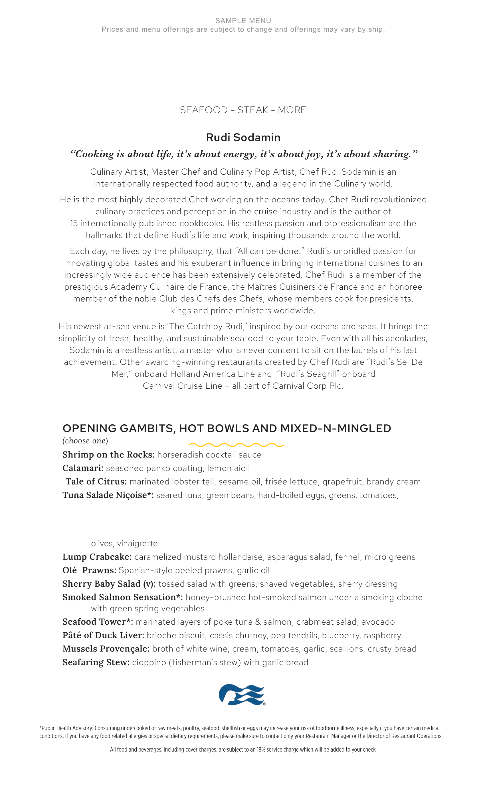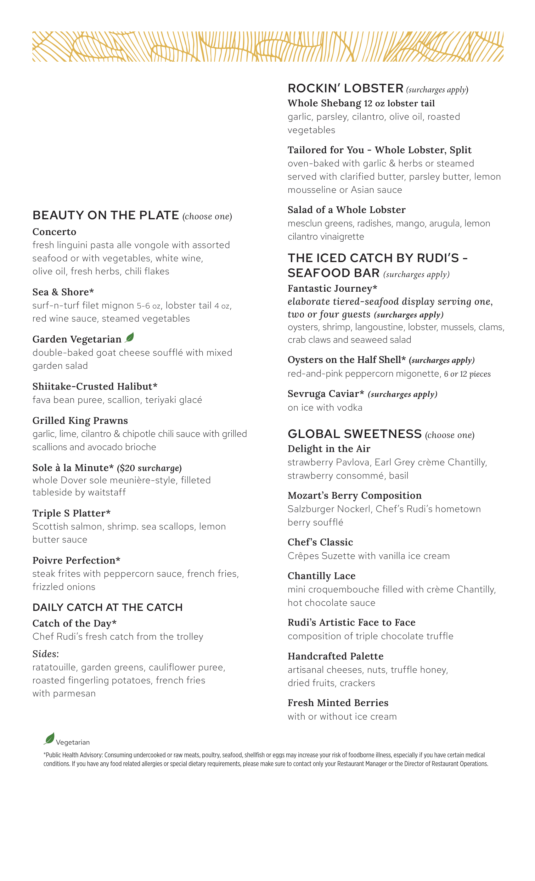 The Catch is the specialty seafood restaurant onboard Princess Cruises, featuring a dinner menu centered on fresh seafood prepared in a range of classic and modern styles. The menu includes crab cakes, prawns, mussels, cioppino, lobster, oysters, and daily catch selections, along with pasta, vegetarian dishes, and steak options. Desserts range from soufflés and crêpes to chocolate and fruit-based selections.